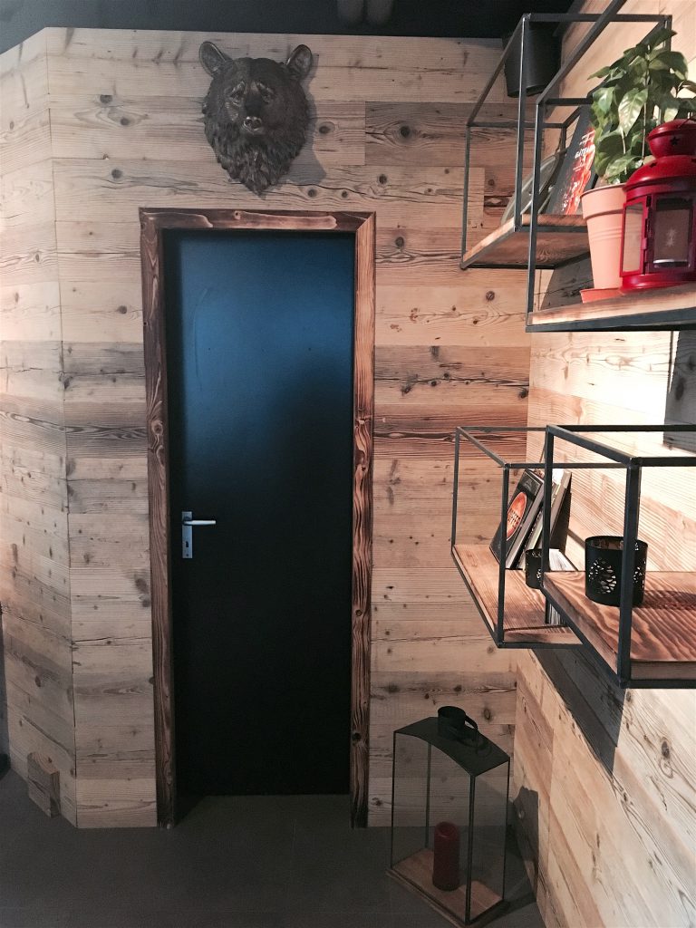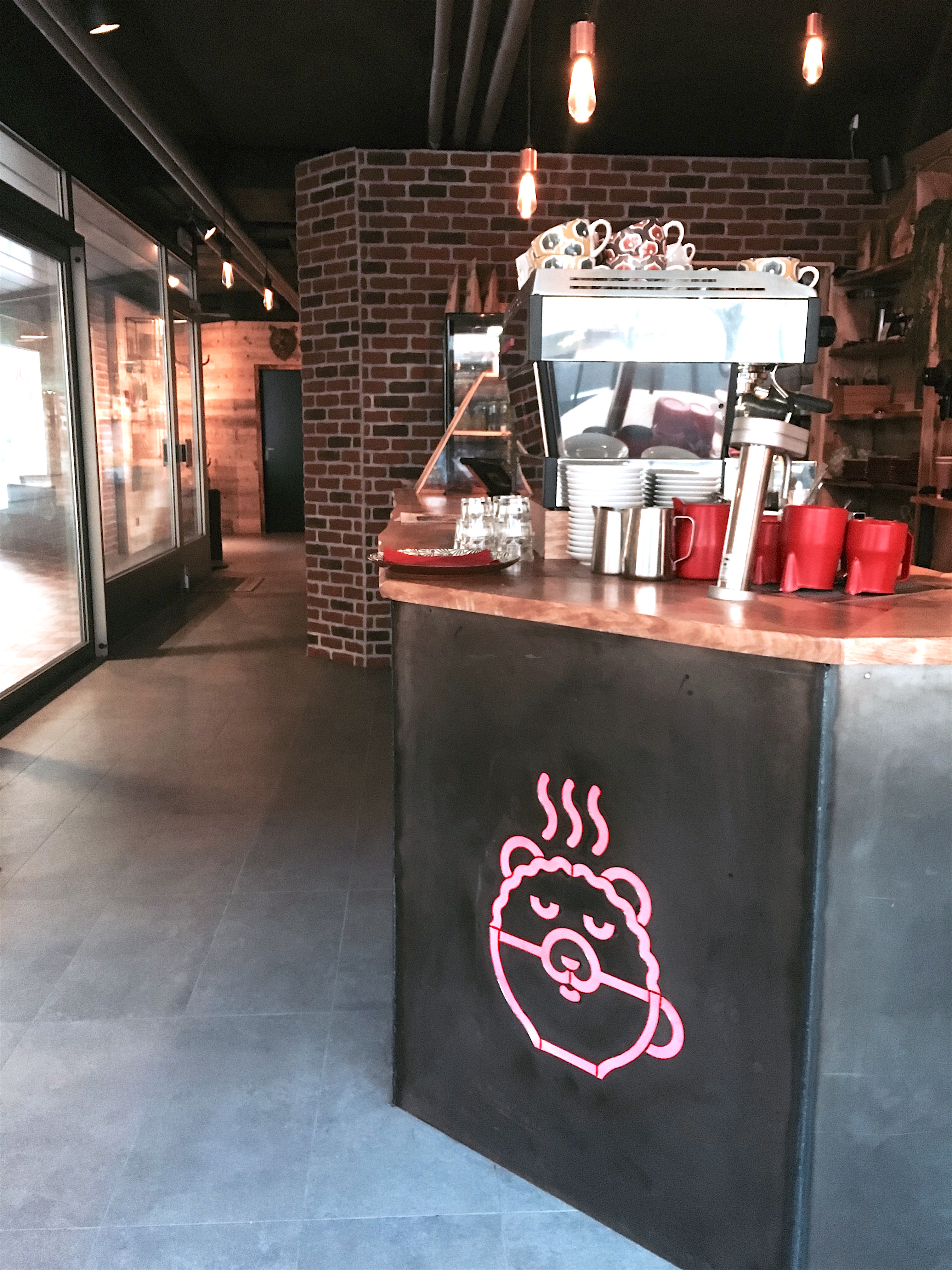 Concernant le lieu, la déco est boisée et minimaliste, un brin forestière. Une tête d’ours sculptée trône en dessus d’une porte et les briques rouges au mur me rappelle New York, tout ce que j’aime.
