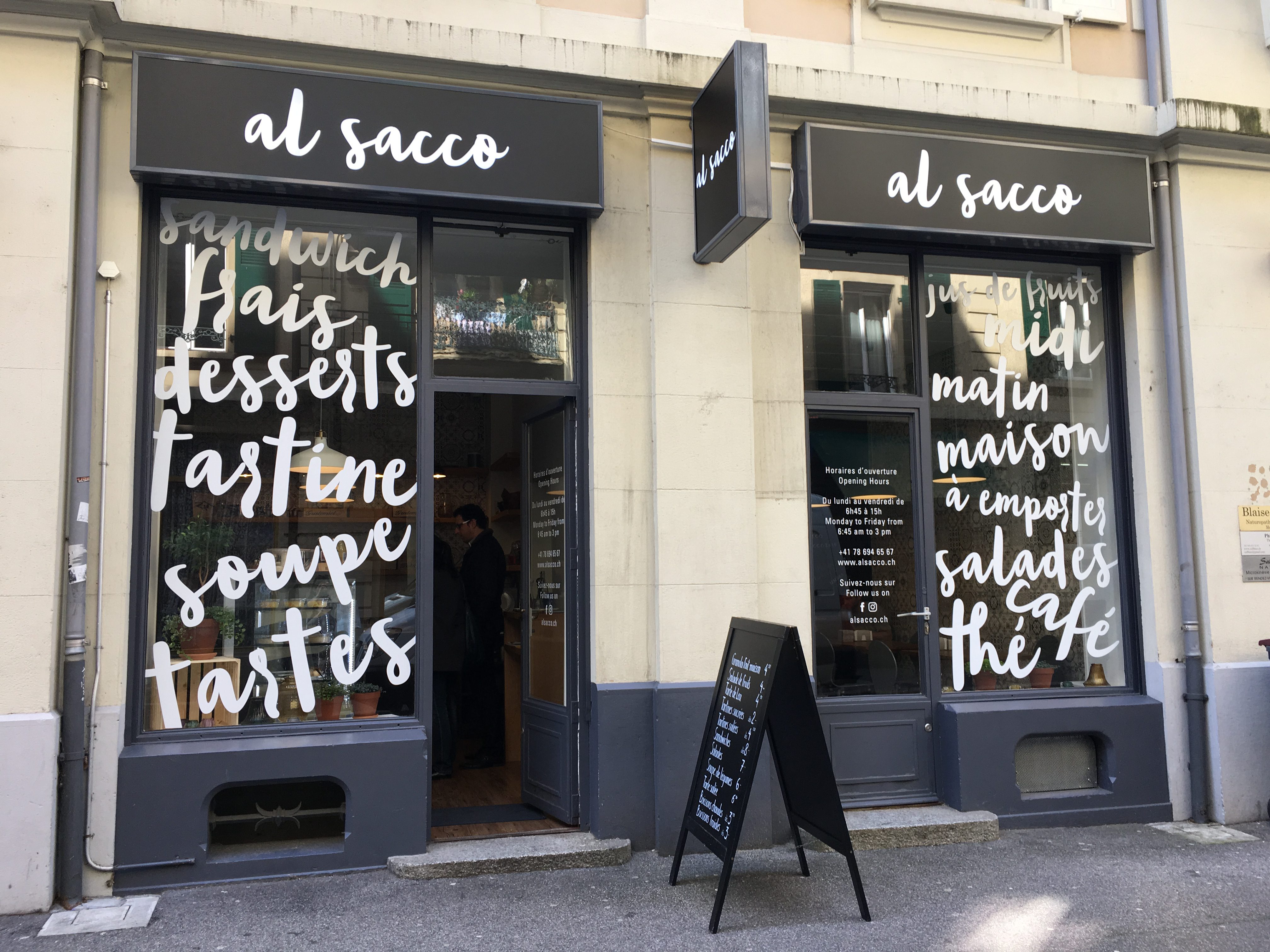 Direction ensuite, la rue du Simplon pour la pause de midi. Cette chouette petite sandwicherie aux grandes écritures blanches sur sa façade propose des mets maisons à l’emporter ou à manger sur place.