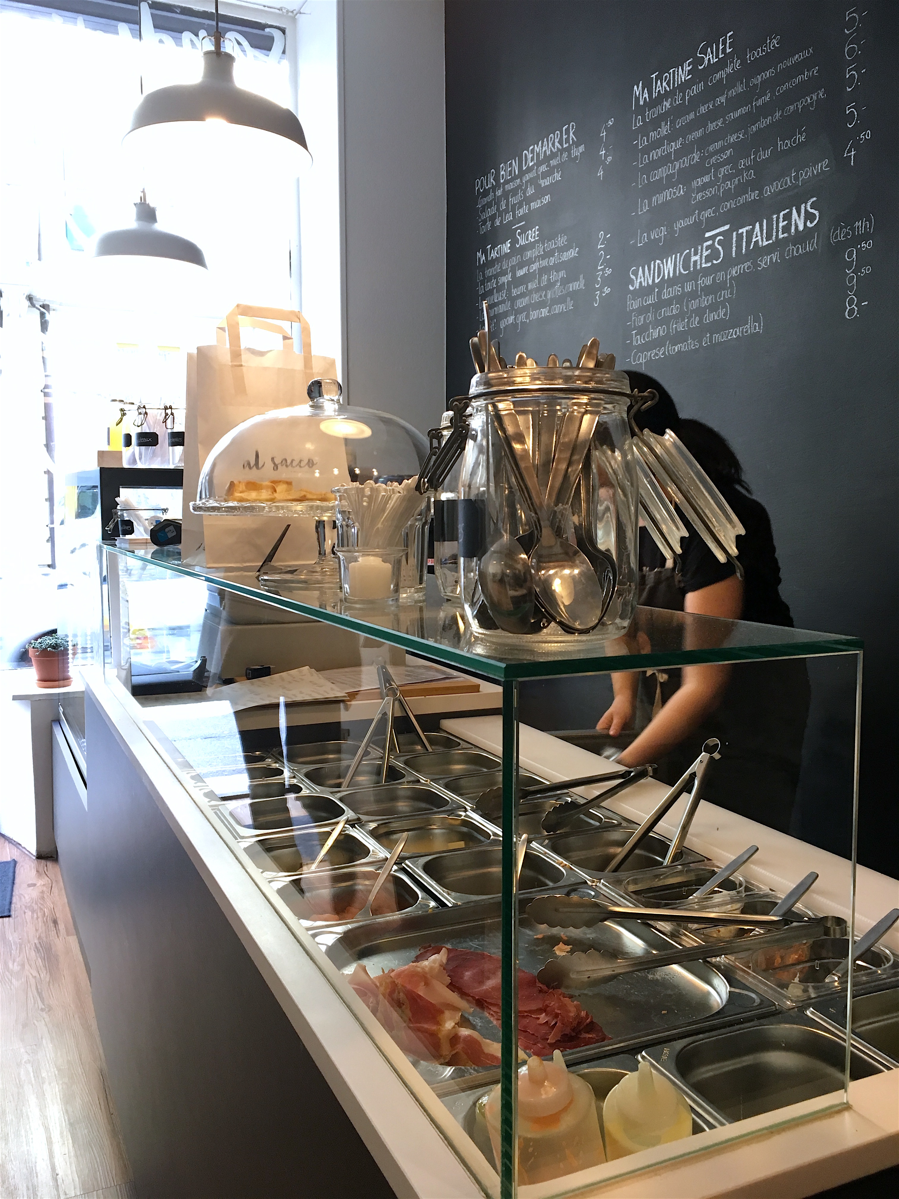 Le style du lieu qu’a voulu donner Lea, la gérante, est vraiment très réussi! Le menu est écrit sur ardoise en grand et le pain frais ainsi que les ingrédients se trouvent sur de jolies étagères en bois… comme si on était à la maison.