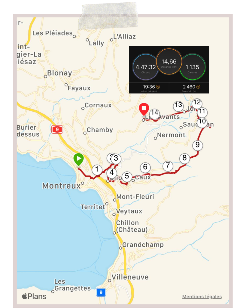 Ce chemin nous a fait passer par Glion et Caux, qui sont certes des jolis villages mais la montée est très rude et pas des plus intéressantes, je vous suggérerais donc de prendre à gauche à l’intersection dans les gorges, le chemin est moins techniques et plus agréable.