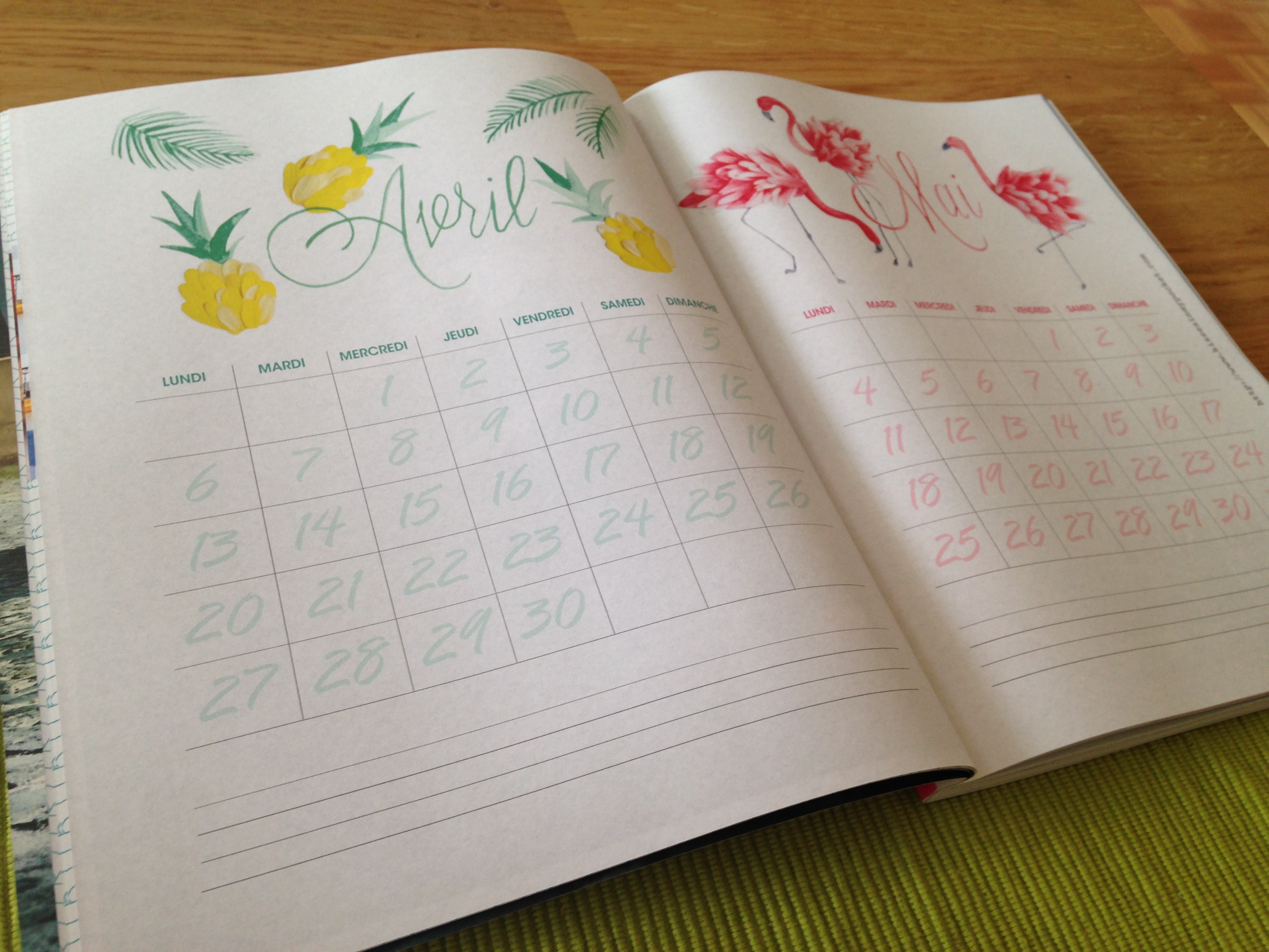 A la suite de chaque thème, il y a des pages de notes/wishlist pour ne pas oublier ce qui nous a plu et noter ce qu’on aimerait s’offrir par exemple. On y trouve aussi deux pages-calendriers très jolies, à détacher et à mettre sur son bureau, j’adore l’idée! Et à la fin, place à la récréation… on sort nos plus beaux crayons de couleurs et on donne vie aux jolis motifs imprimés.