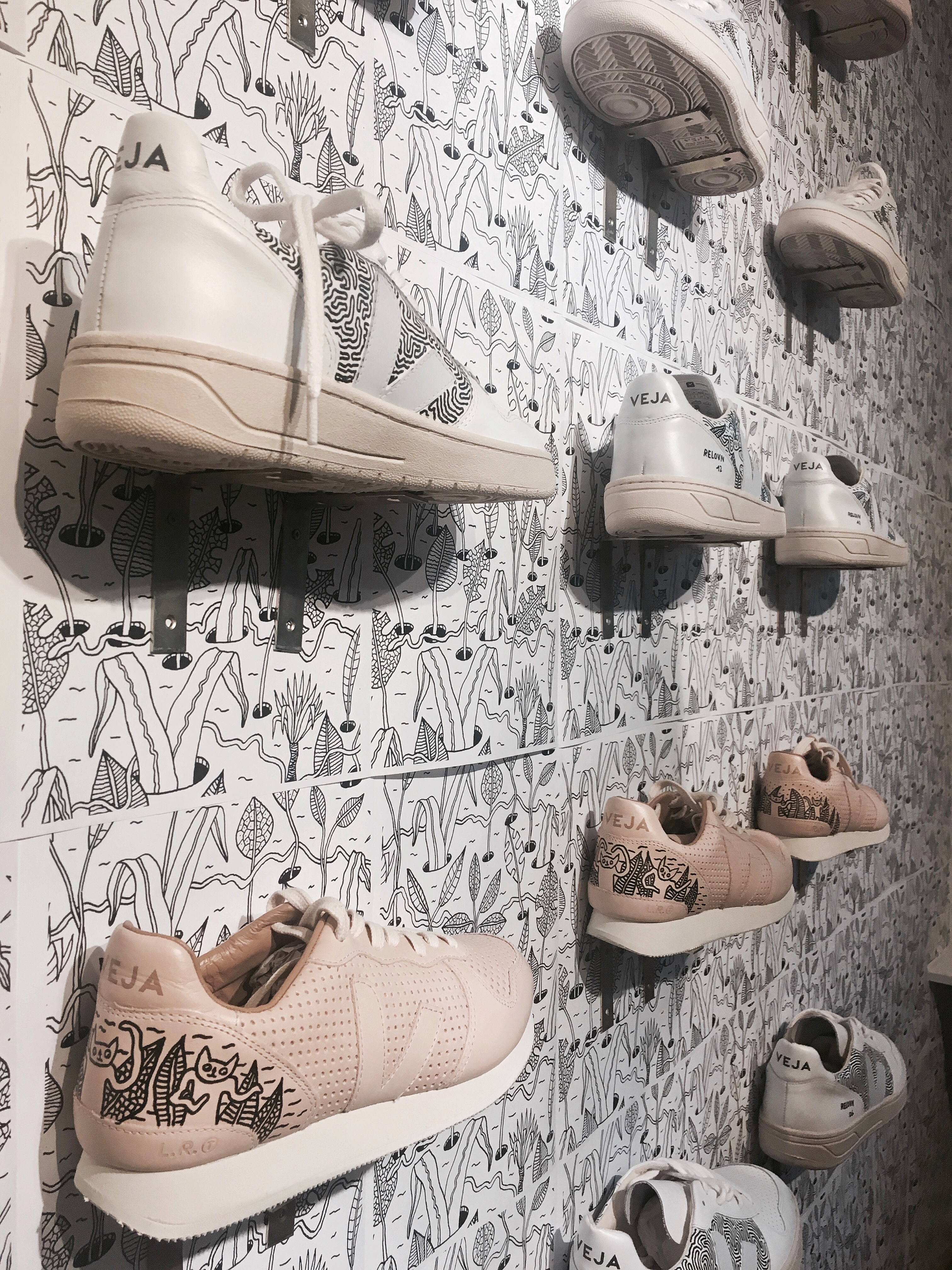 Lilian, la responsable, ayant à coeur de prendre soin de ses clientes de la tête aux pieds, a fait appel aux labyrinthes végétaux de l’illustrateur Relovn pour proposer une collection unique en son genre, celle de baskets pimpées en édition (très) limitée. Elle a profité de l’occasion pour donner un look un peu plus « junglesque » à son atelier, en affichant les mélis-mélos sauvages de Relovn aux murs.