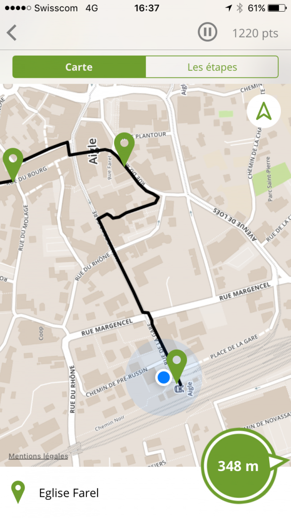 Nous voilà en fin de parcours à la gare d’Aigle, après plus de quatre heures de marche et 9km parcourus. L’heure du verdict a sonné, téléphones tendus, nous comparons nos scores…. J’ai GAGNÉ!