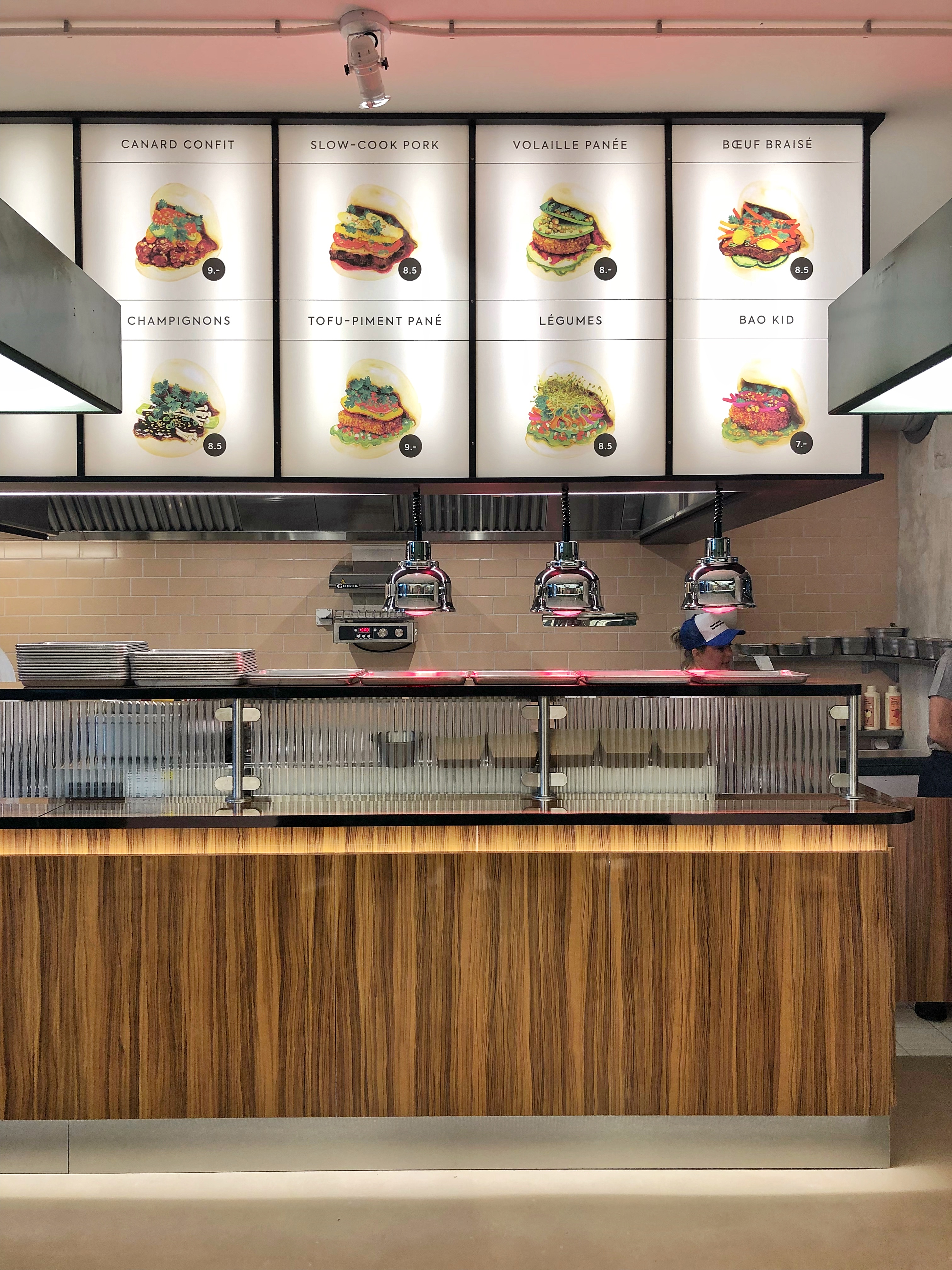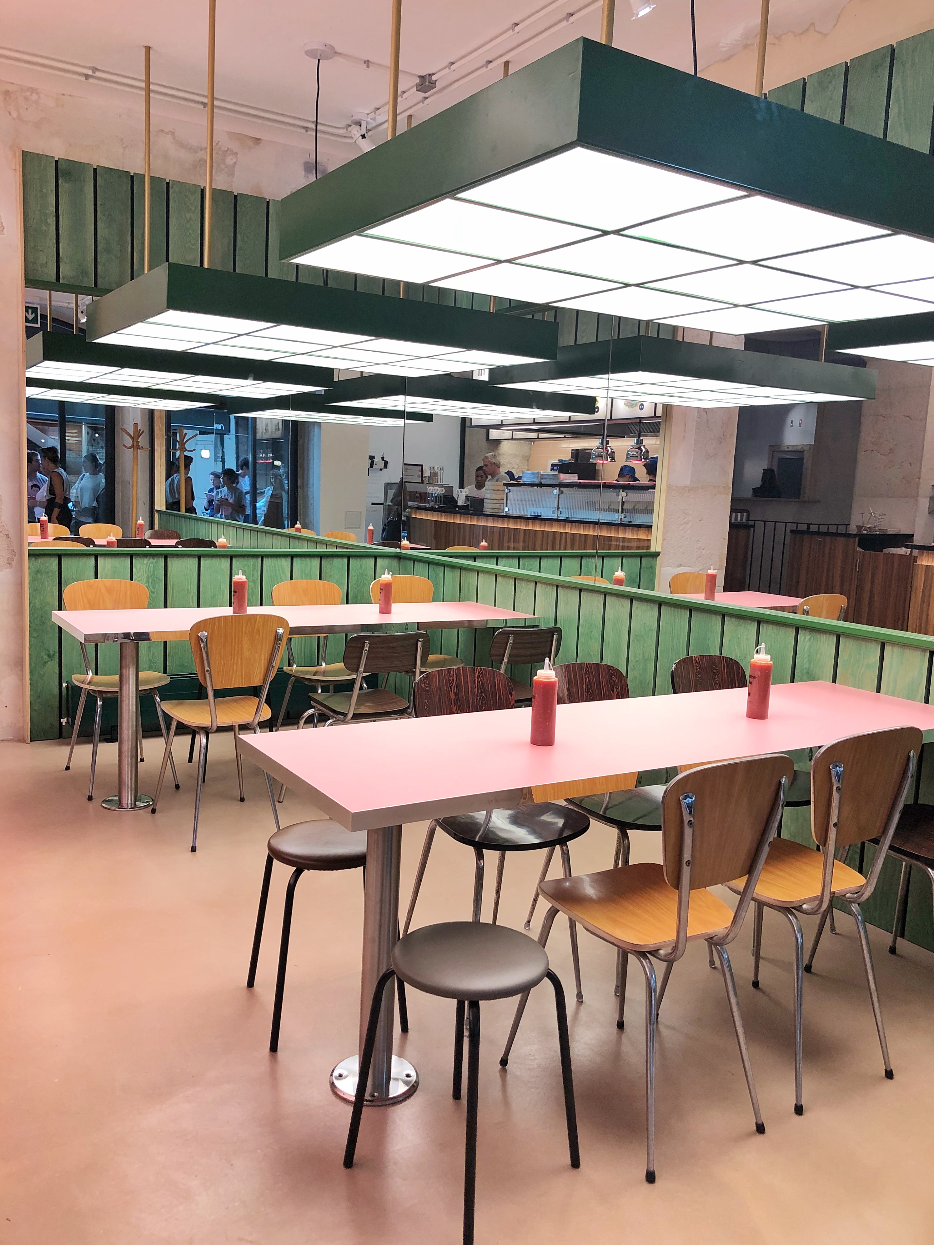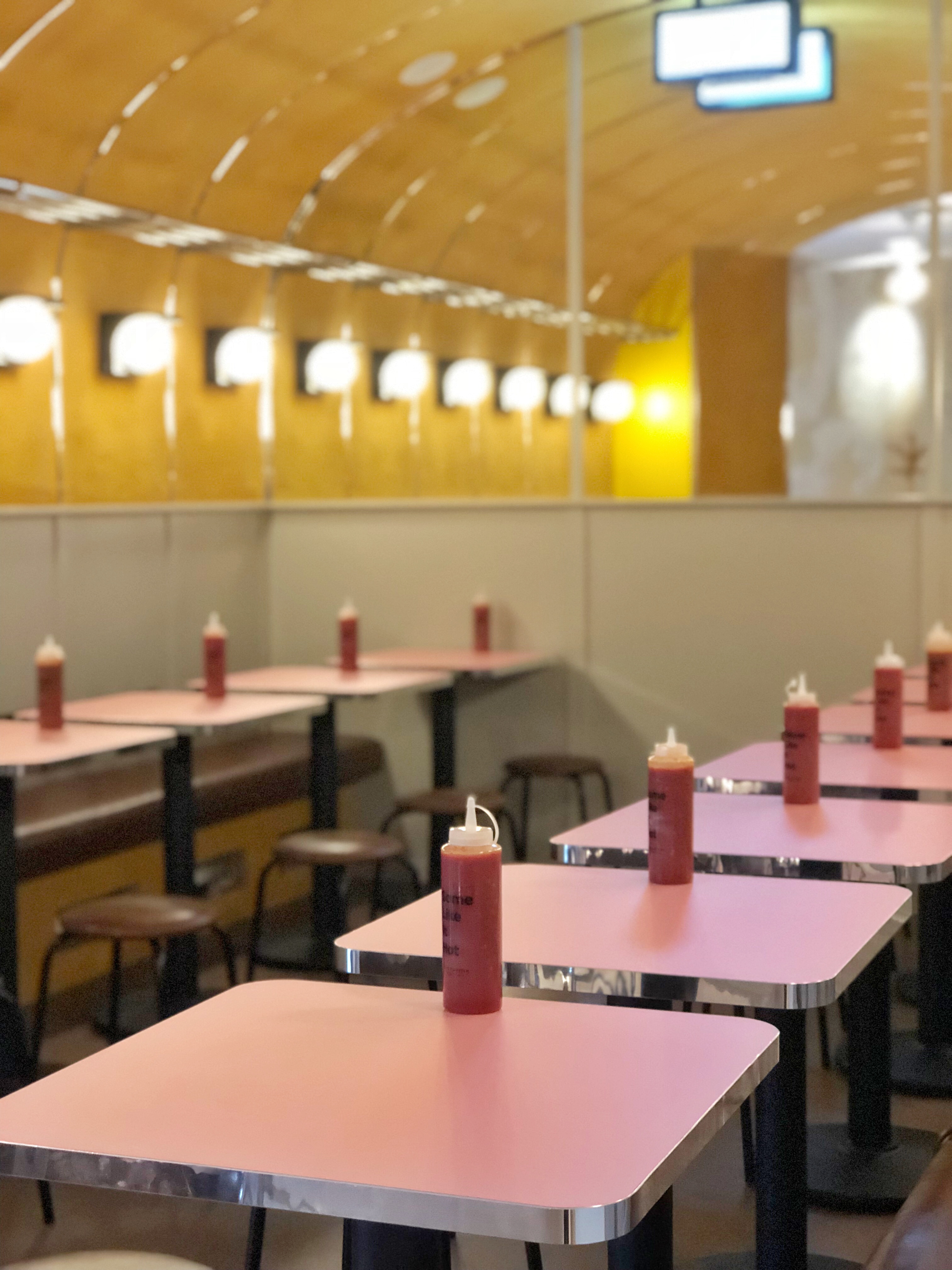 Voulant séduire les jeunes, les lieux ont été aménagé comme un fast-food, le mobilier est simple mais très sympa. Dans les tons rose pâle, le restaurant est très tendance, parfait pour satisfaire les accros d’Instagram.