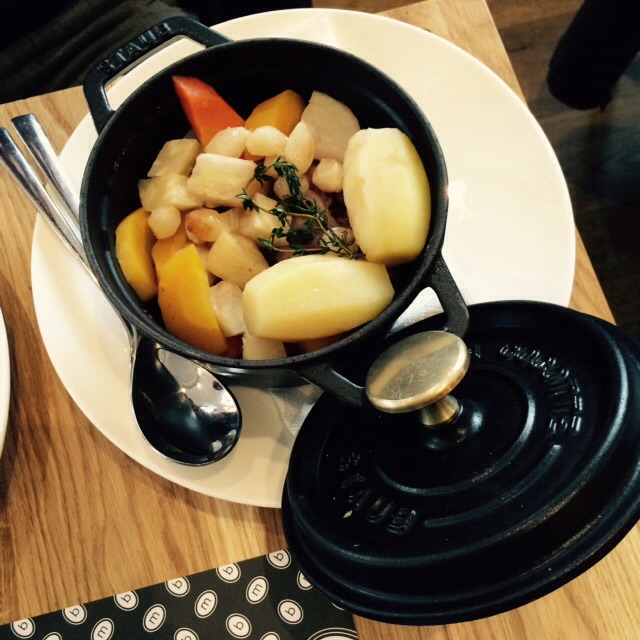 Mon acolyte a lui pris un pot-au-feu, présenté dans une jolie petite marmite: