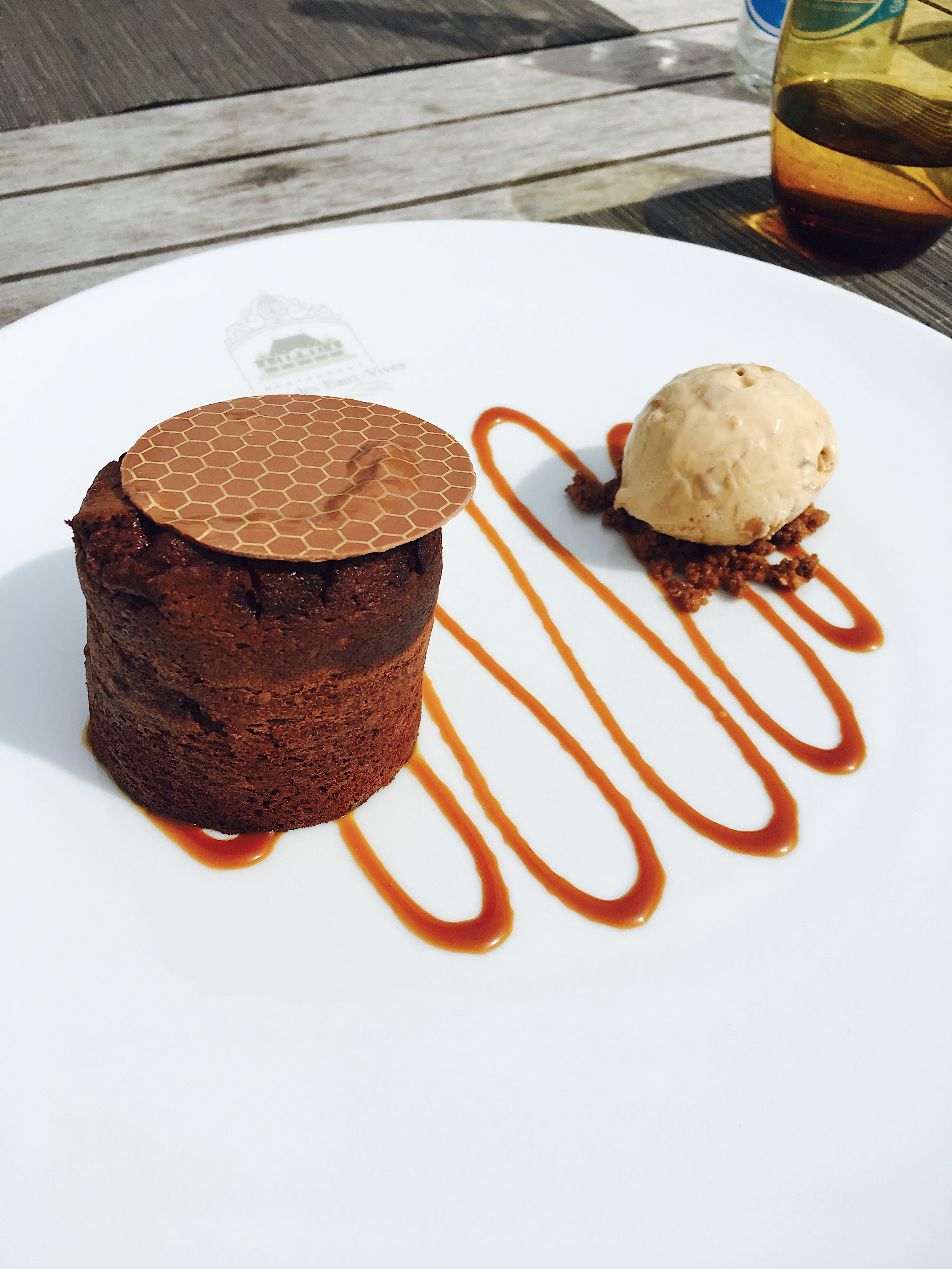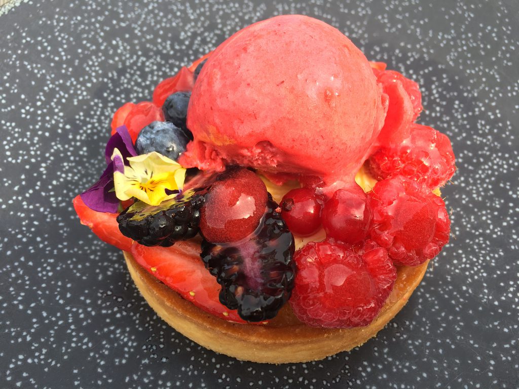 Dans l’ensemble, les plats étaient bien présentés et les portions plutôt généreuses. Mon chéri a choisi le poulet fermier et et pour ma part j’ai opté pour les pâtes aux aubergines. Nos plats manquaient un tantinet de saveurs et d’assaisonnement, mes pâtes étaient un peu trop cuite à mon goût. Par contre, gros coup de coeur pour les desserts, rien que l’intitulé fait rêver « Le mi-cuit au chocolat Valrhona, coeur coulant, crème glacée au caramel et flocon de sel de Maldon (sans gluten) »…mmmh! J’en recommanderais bien un là tout de suite maintenant. La tartelette aux fruits rouges et sa boule de glace était aussi délicieuse.