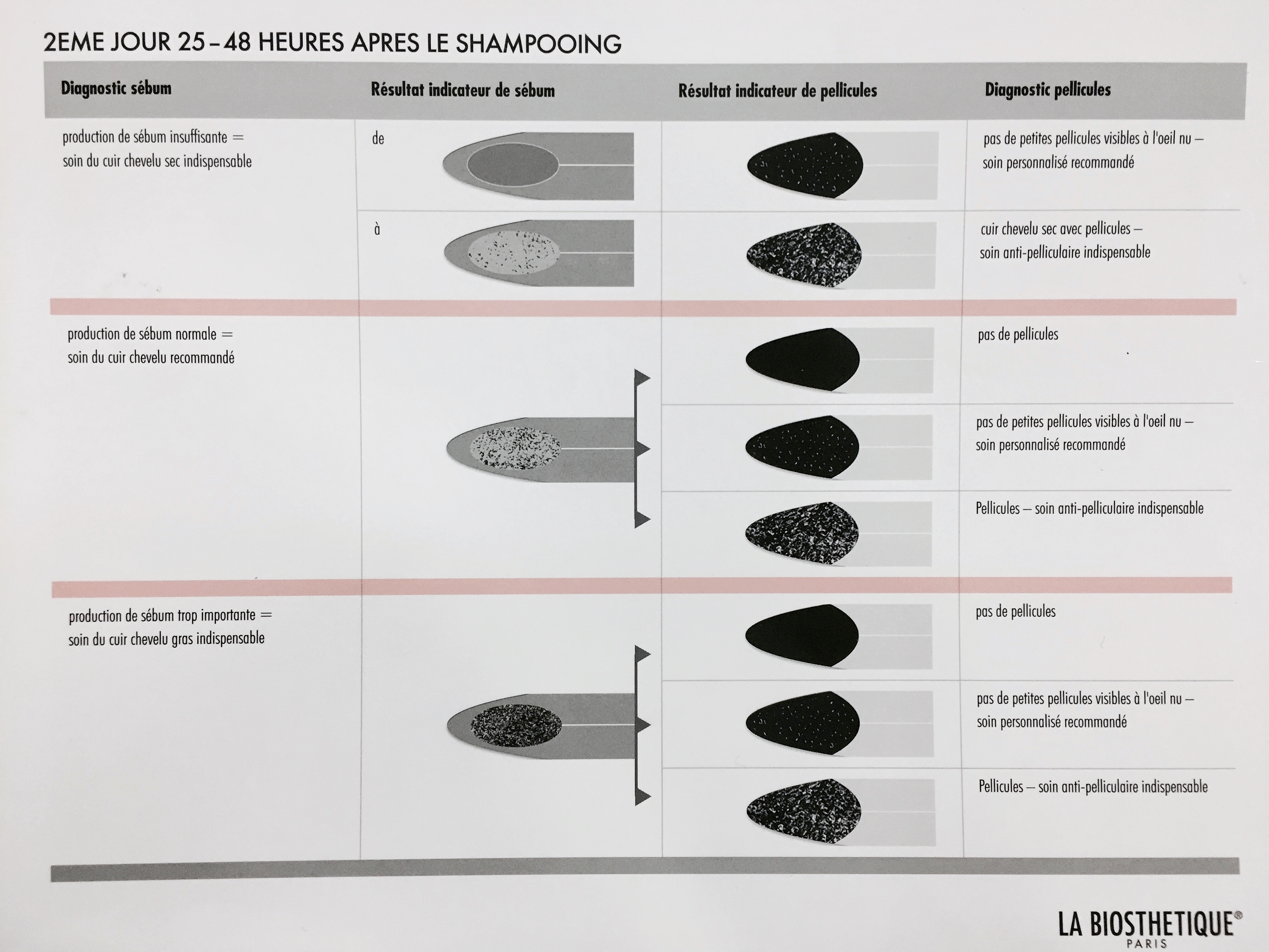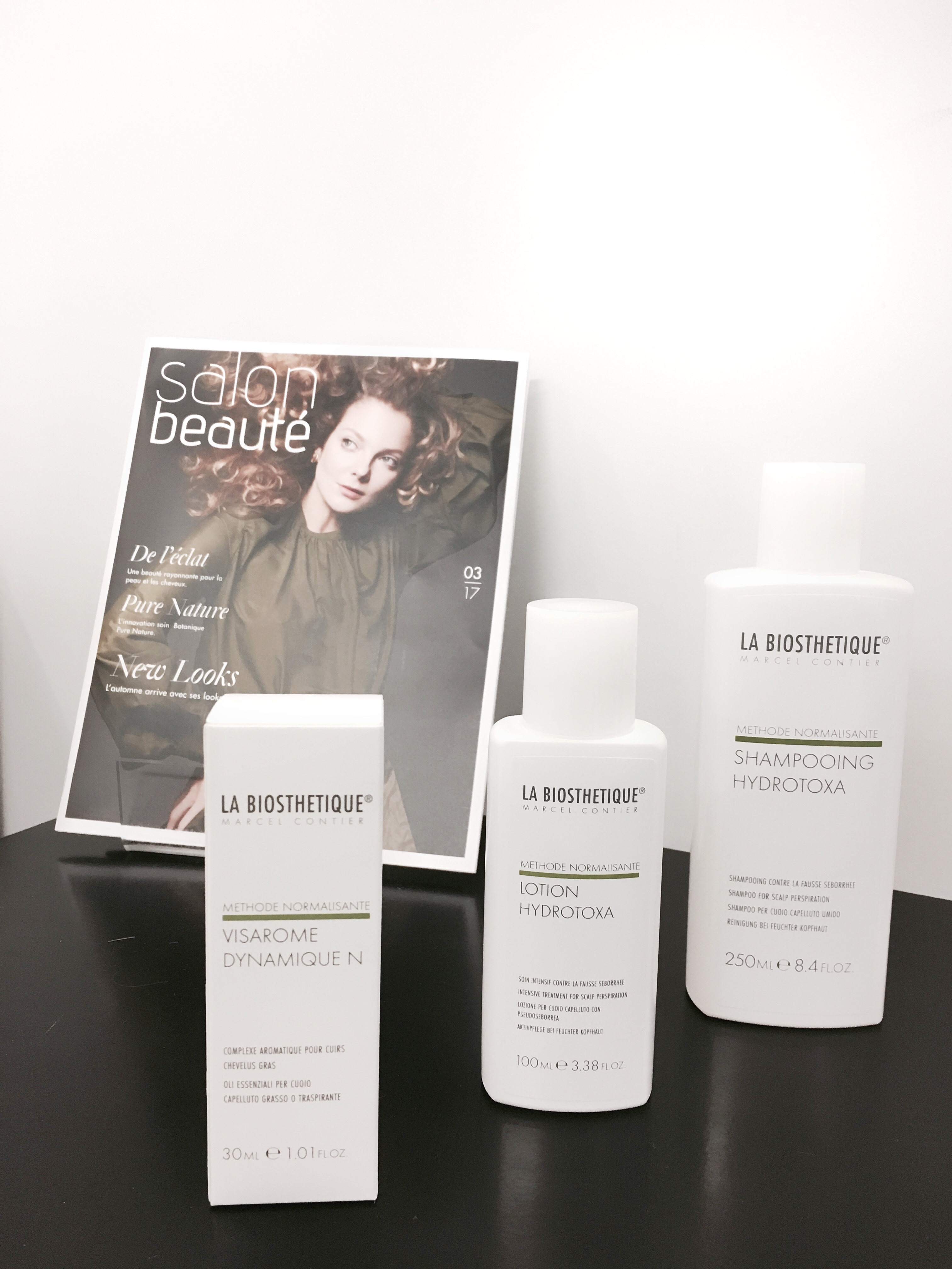 Lors de mon premier rendez-vous, j’ai pu faire un diagnostic de mon cuir chevelu qui a révélé que je produisais rapidement du sébum, l’effet brillant qu’on prend (trop) souvent pour du gras. C’est très fréquent sur les cheveux fins. Pour remédier à ce problème, le salon possède la gamme Biosthétique, dont j’ai fait la découverte.