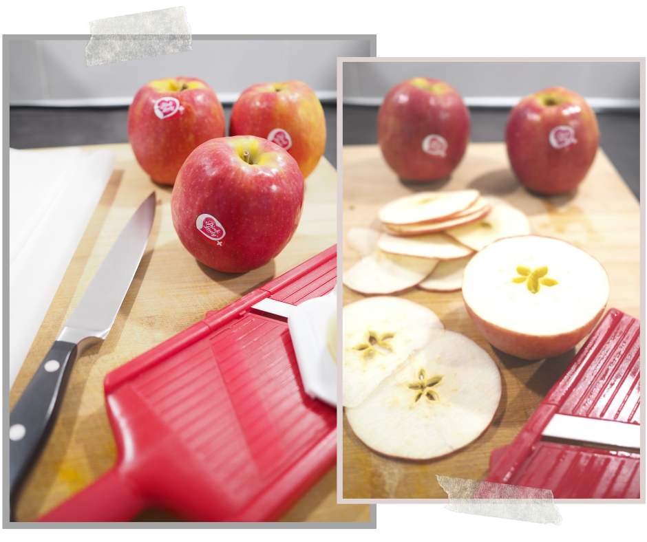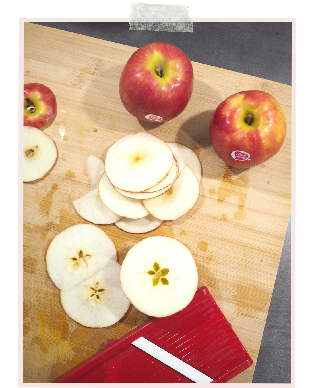 2. Lavez et coupez les pommes en fines tranches (2-3mm) avec une mandoline ou à un couteau très bien aiguisé