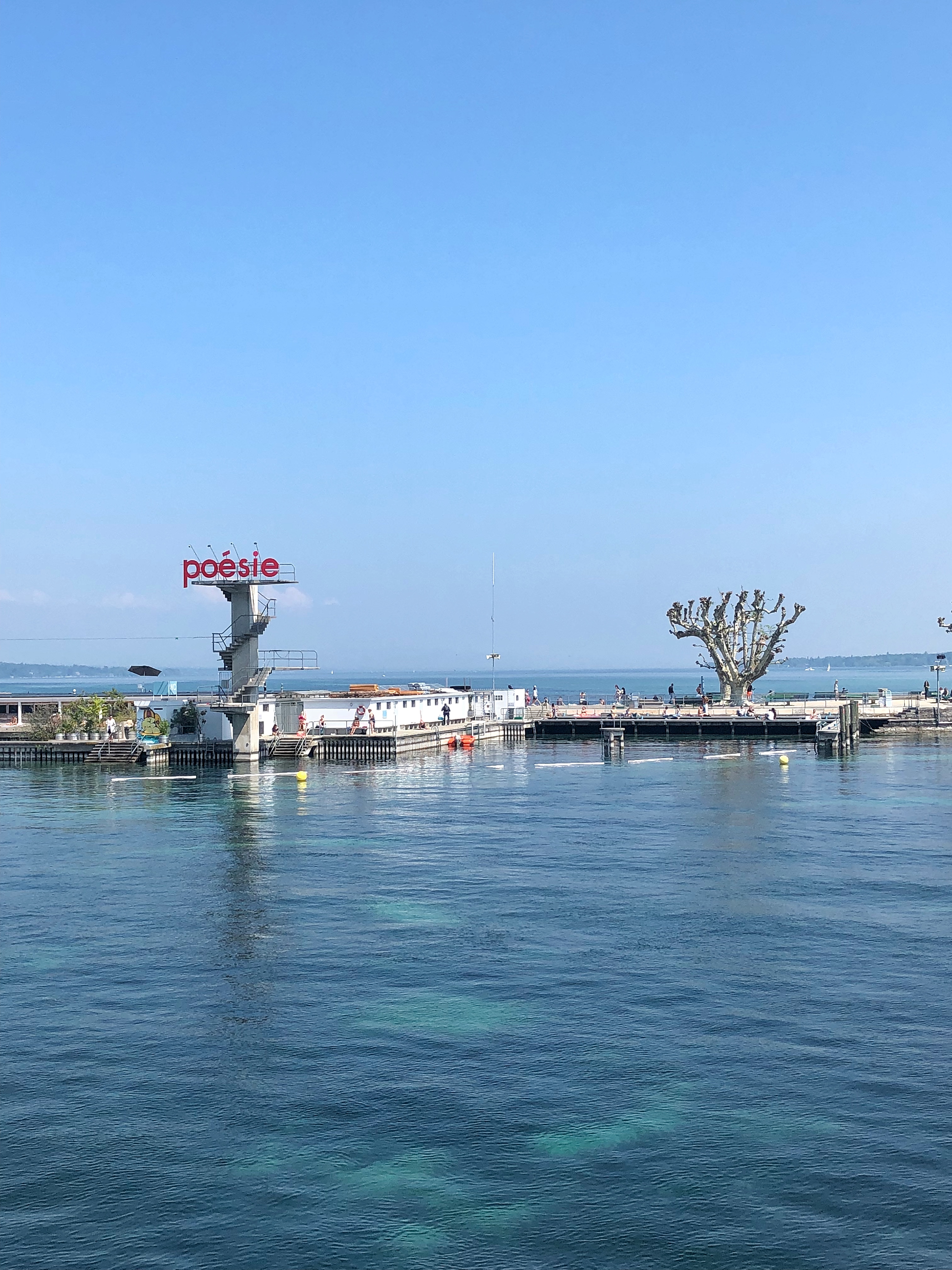 Le départ du bateau a annoncé le début de notre menu et nous a surtout offert une vue imprenable sur la rade. Le jet d’eau était en fonction et bien que nous ayons l’habitude de le voir régulièrement, il était particulièrement beau en ce jour, de par cette nouvelle perspective. L’eau était turquoise, grâce au vent et à la saison, ce qui nous a donné l’impression d’être sur un autre continent. C’était idyllique.