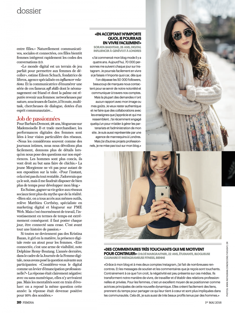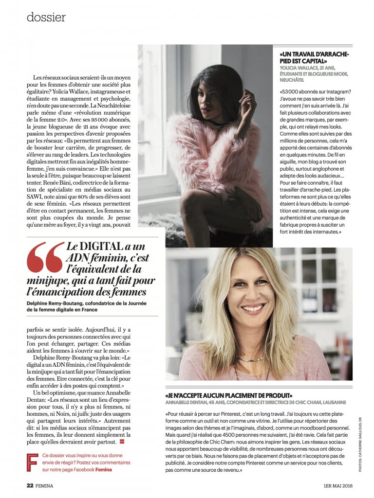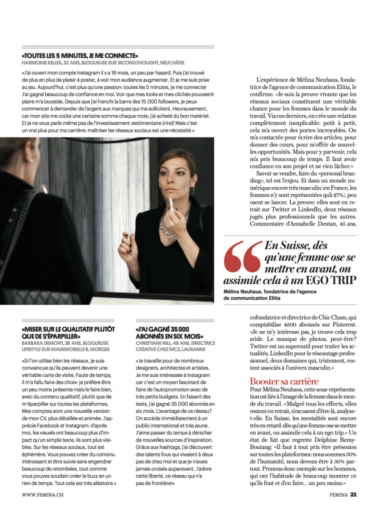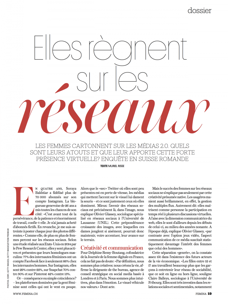 J’ai eu la chance de pouvoir participer à un article très intéressant sur les réseaux sociaux. Un grand merci à Femina et Muriel Risse pour ces quatre pages!