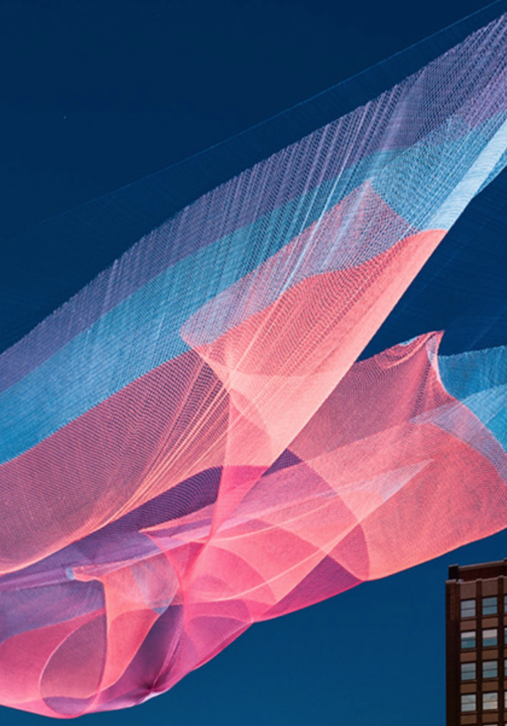 Earthtime 1.26, L’oeuvre de Janet Echelman évolue avec le vent et une mise en lumière dynamique.
