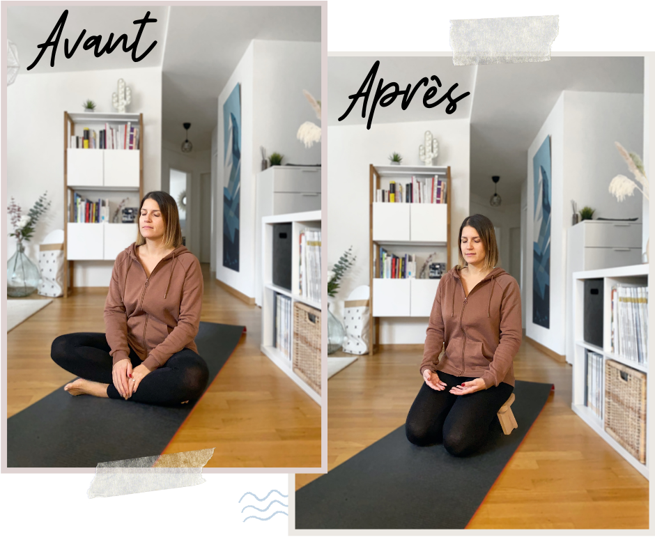 - les postures justes – quand on ne médite pas, on pense que se mettre en tailleur et joindre ses mains suffisent mais en fait, ce n’est pas si simple (voir avant/après ci-dessous)