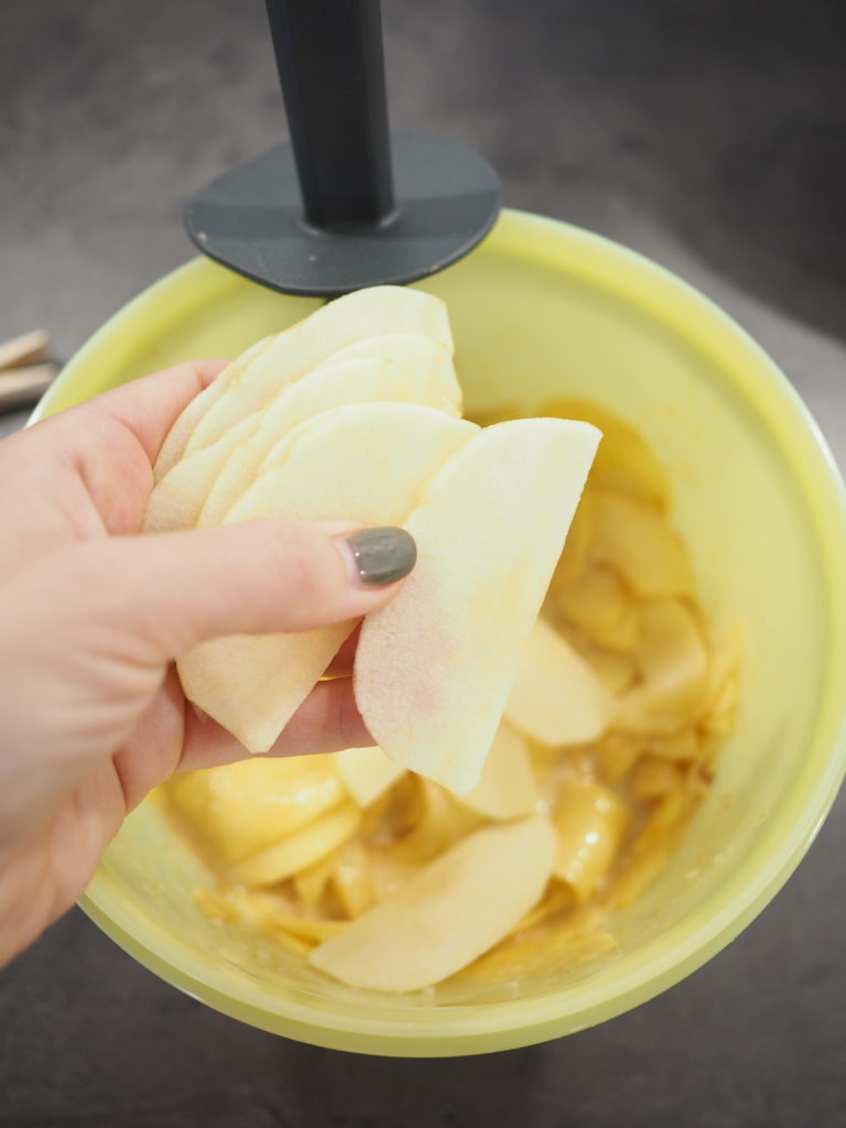 - Ajouter les lamelles de pomme délicatement et mélanger pour qu’elles soient bien enrobées de la préparation
