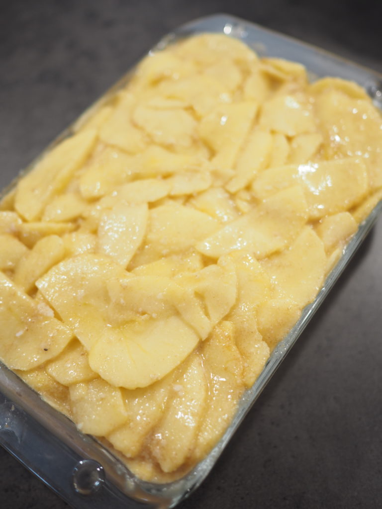Ce gâteau porte le nom d’invisible car la pâte n’est pas répartie dans la plaque comme les tartes standards, les pommes sont mélangée à la préparation et le tout est versé tel quel dans une plaque à gâteau, ce qui donne un résultat plutôt sympa et original à la découpe.