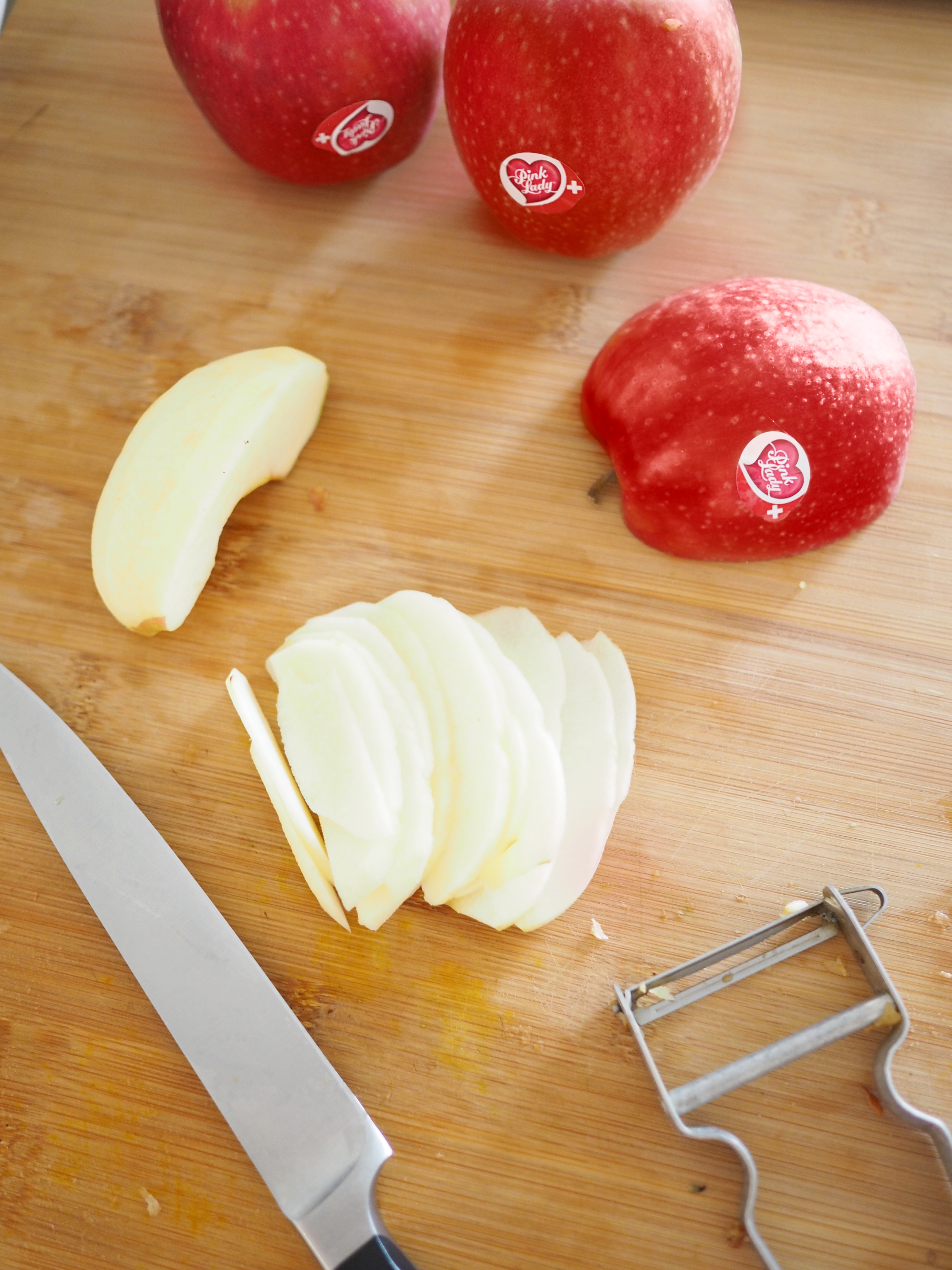 - Peler, retirer le cœur et couper les pommes en quartiers