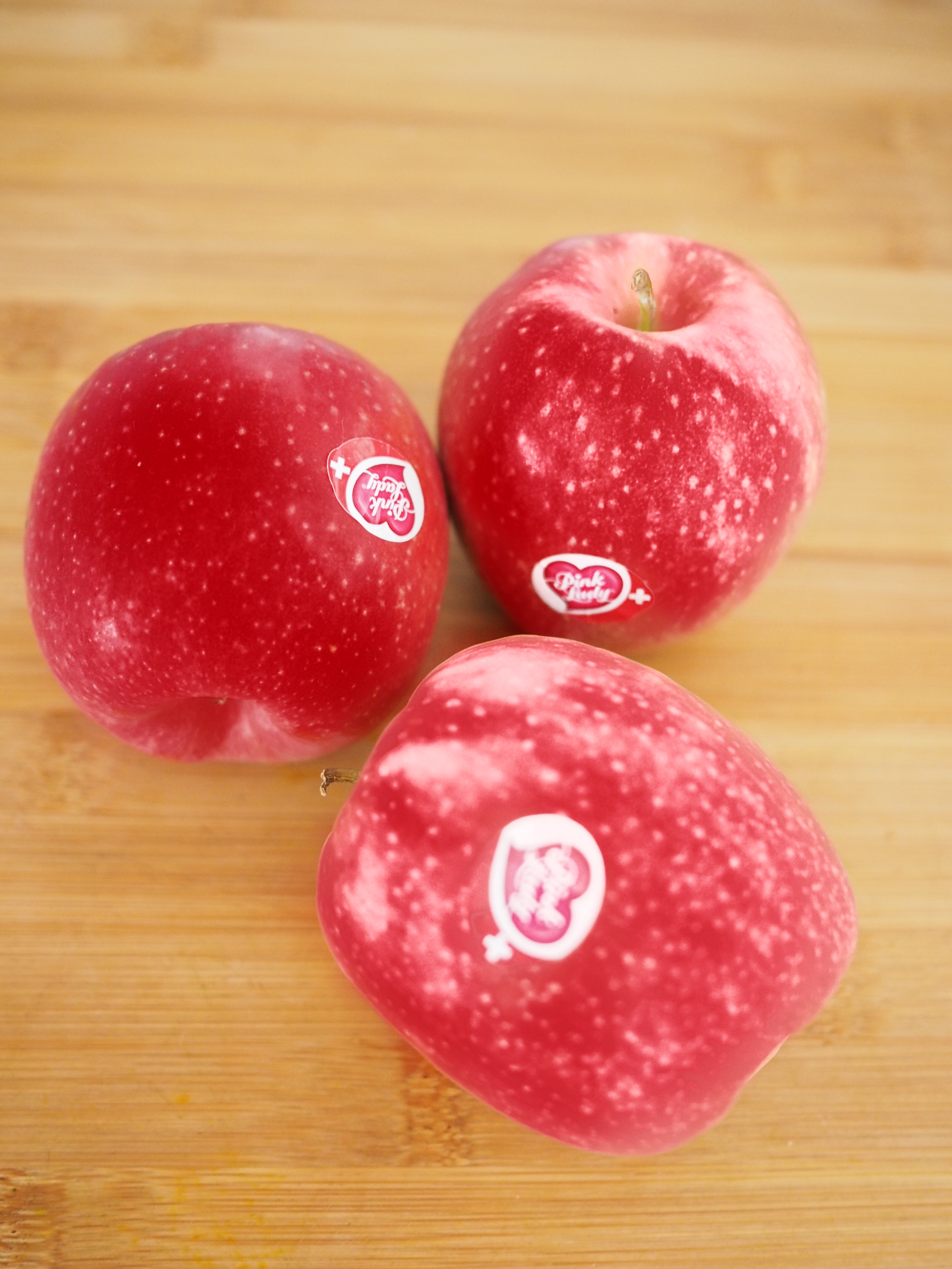Les pommes, en principe, je les choisis bien colorées, juteuses et croquantes. Mes favorites sont donc les pommes Pink Lady qui regroupent toutes ces qualités.