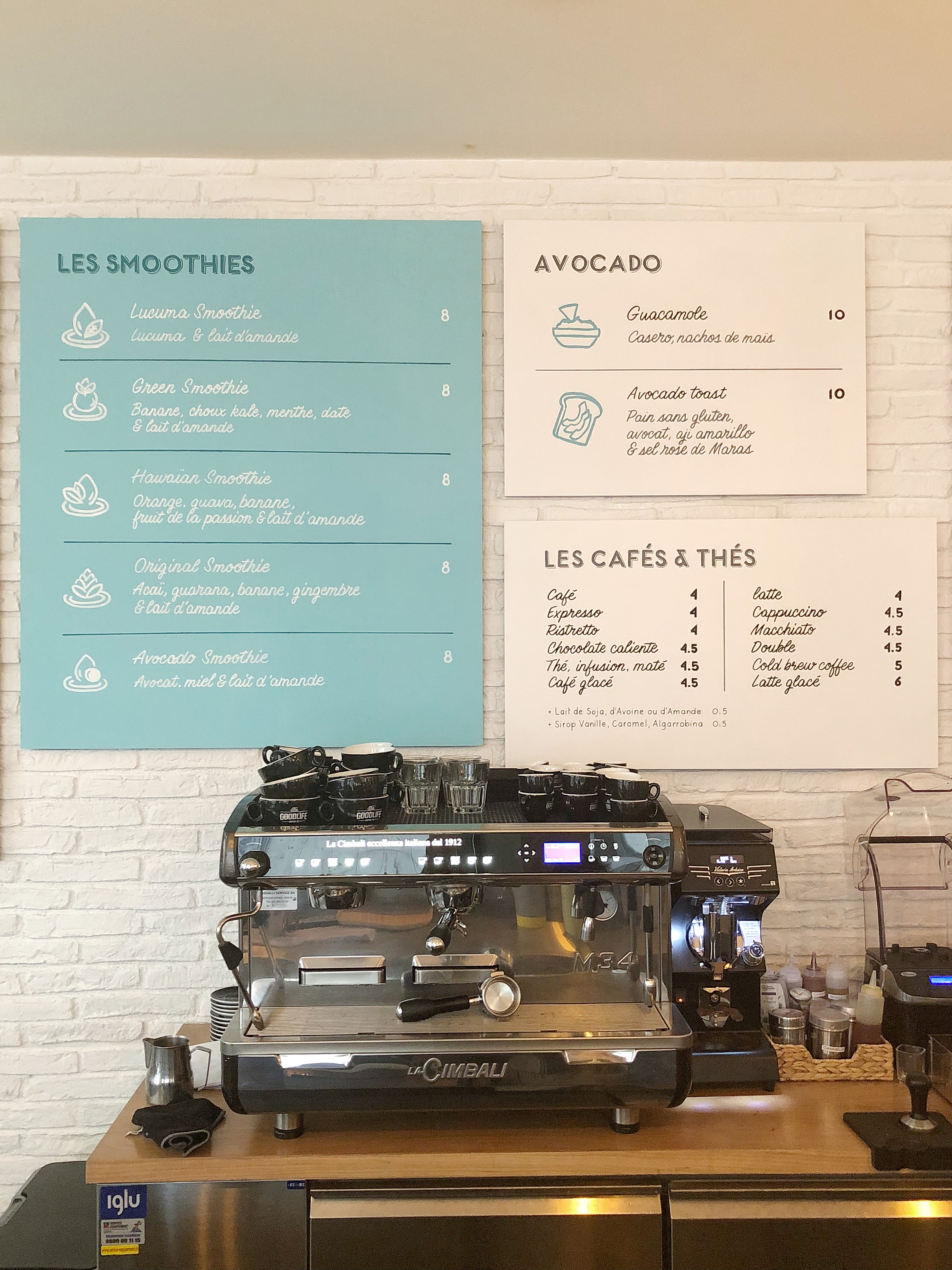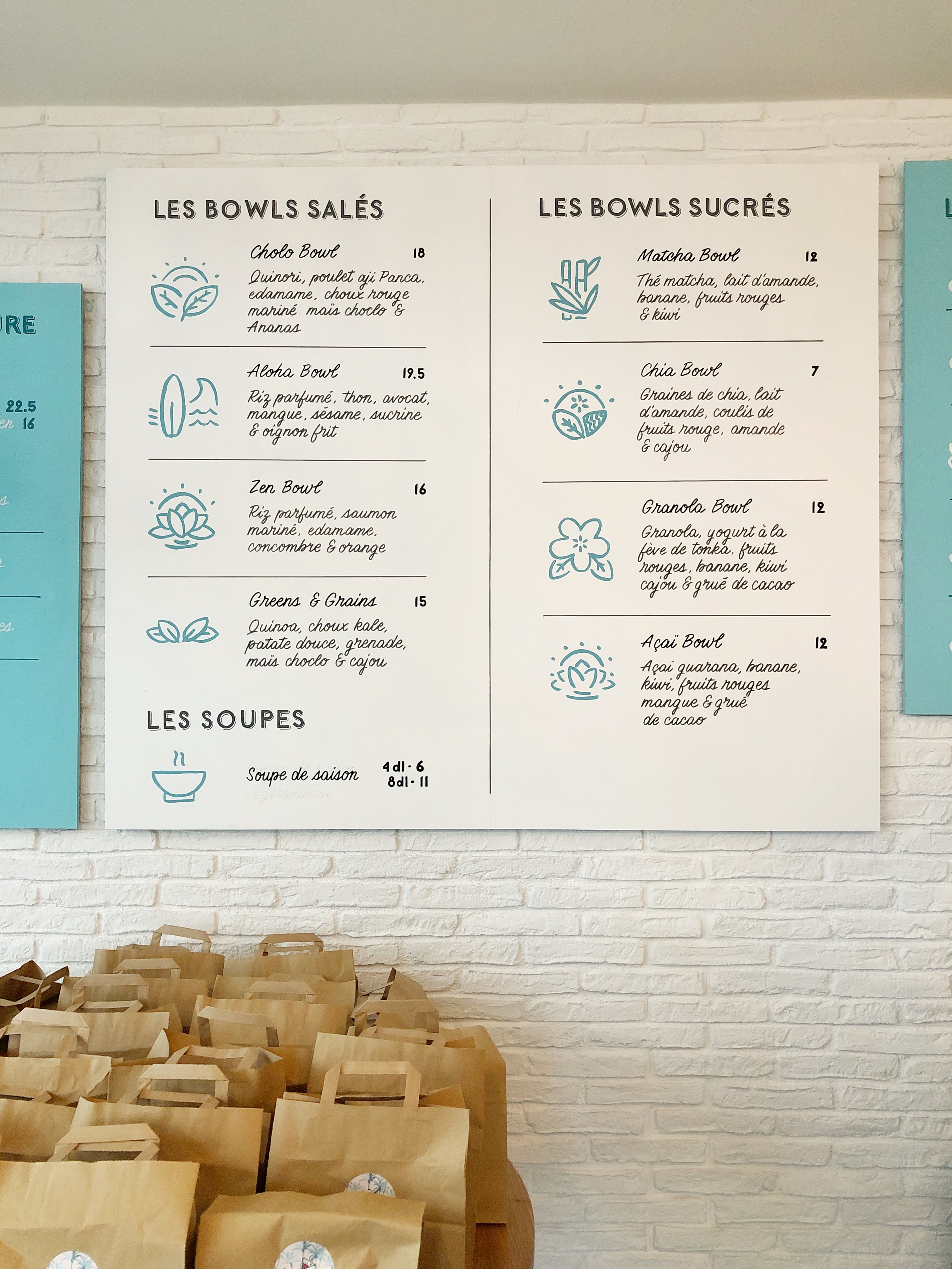 Il est possible de créer son Bowl soi-même ou d’en choisir un à la carte, à manger sur place ou à l’emporter. Il y a aussi un côté « petite épicerie » avec quelques produits bio. Je trouve cool de pouvoir déguster un plat, l’apprécier et pouvoir acheter quelques uns de ses ingrédients pour le refaire à la maison.