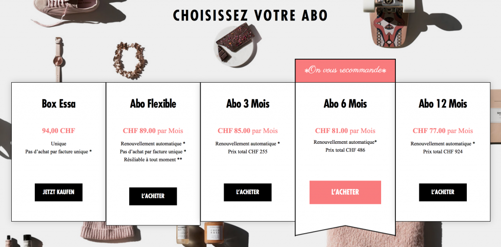 La box unique est à 94 CHF, ce qui est assez élevé comme prix. Plus l’abo est pris sur une longue durée plus le tarif au mois diminue: