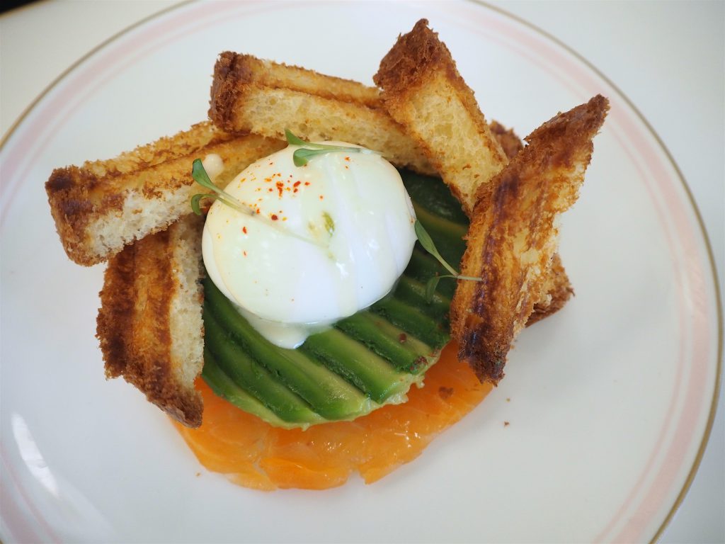 - Mon acolyte a pris l’oeuf mollet servi sur son lit de saumon et avocat. La cuisson était parfaite et le tout était très goutu – 26 CHF