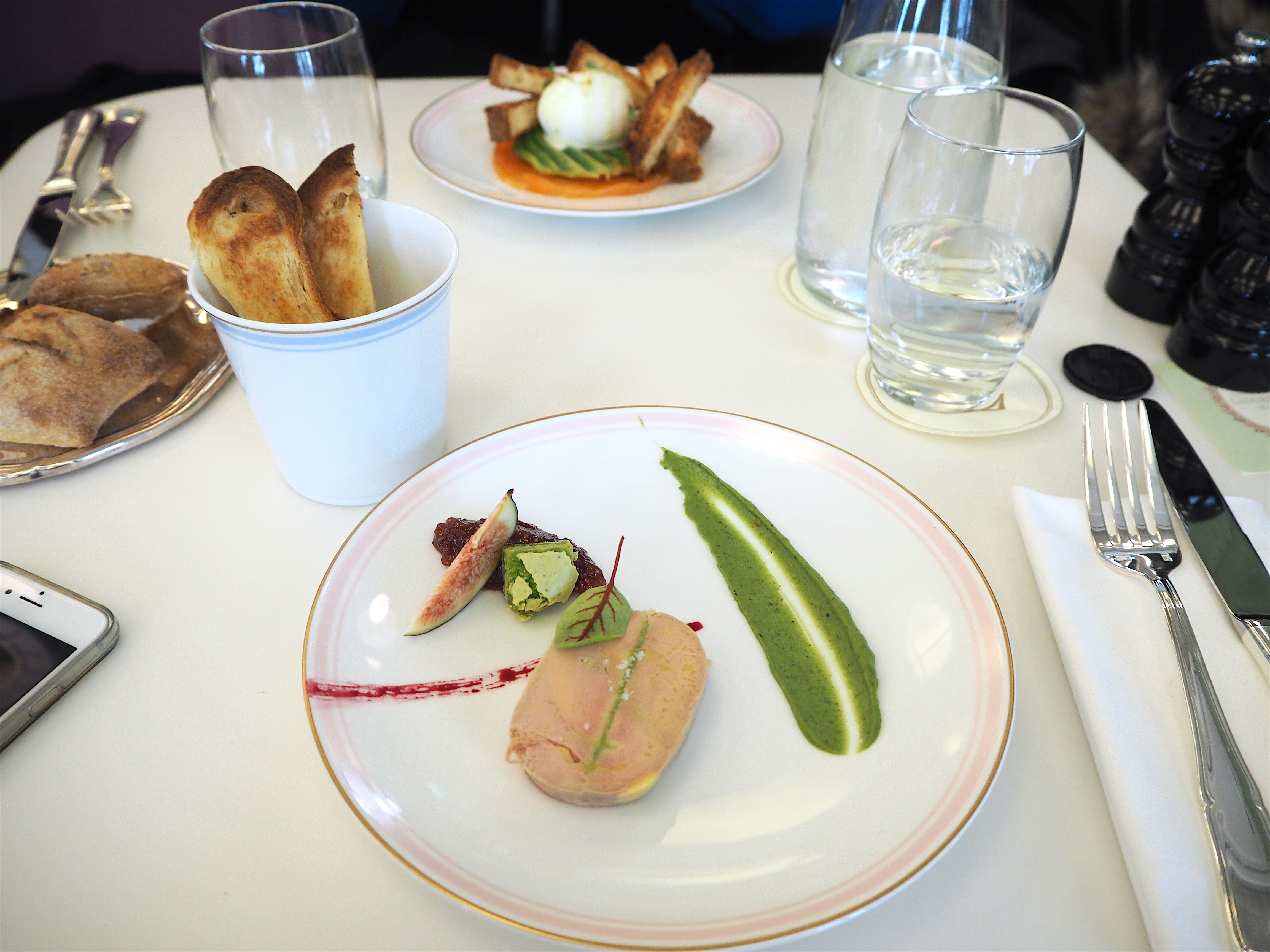 - J’ai opté pour une entrée au foie gras (rien que ça), qui était délicieuse! Le petit plus du plat; le pain toast brioché dit « Kugelhopf » – 28 CHF