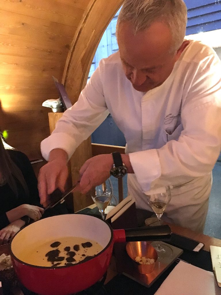 Nous avons ensuite fait la connaissance du Chef Edgard Bovier (18 points Gault Millau / une étoile Michelin), un homme rempli de peps et de bonne humeur! Il a veillé à notre bien-être tout au long du repas, jusque dans notre caquelon d’ailleurs…