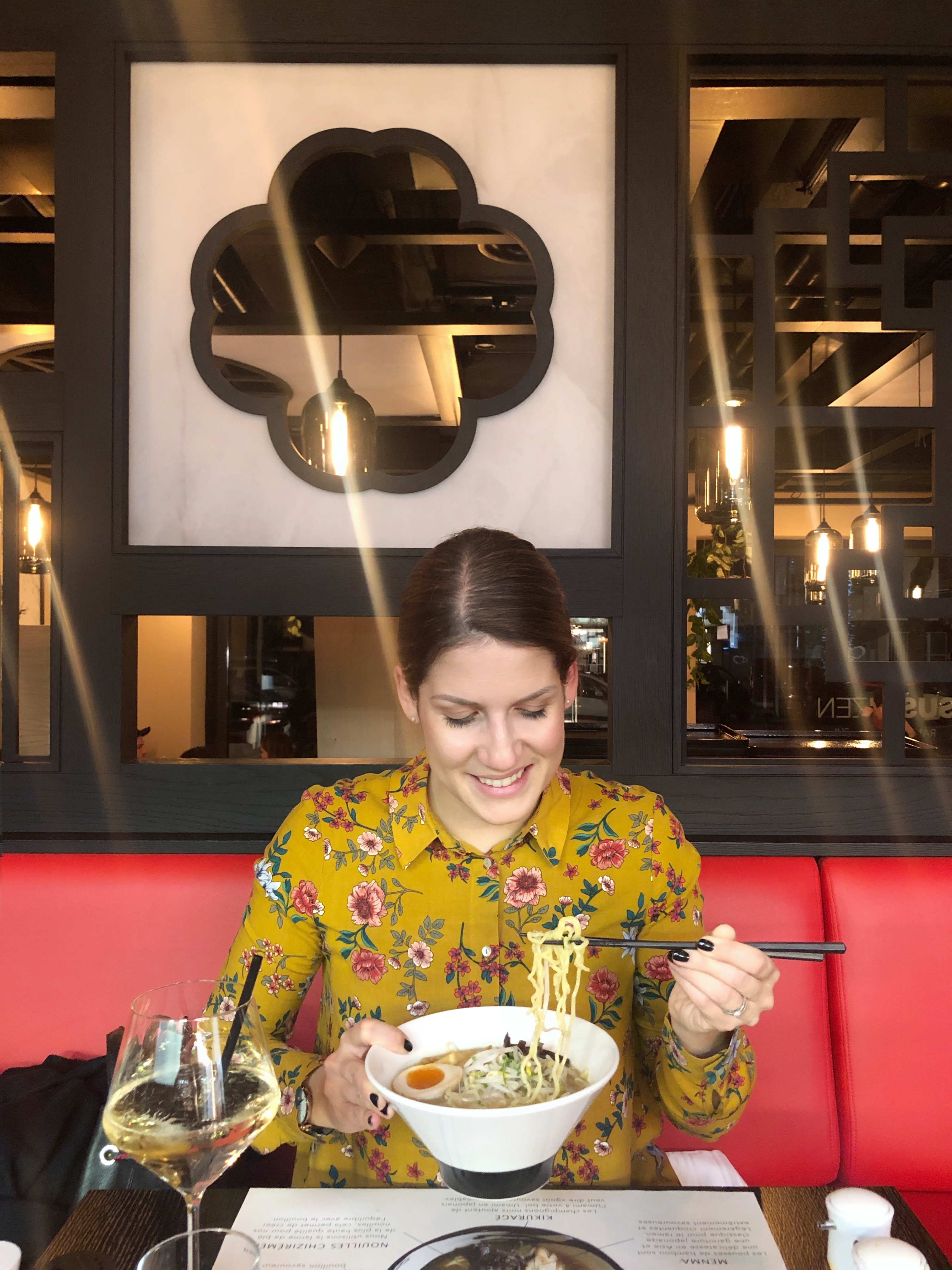 Pour le plat principal, sans grande surprise.. un ramen végétarien (19 CHF). N’étant pas friande de viande de porc, j’opte souvent pour la version au bœuf ou végétarienne, j’ai goûté le porc séparemment et j’avoue que la manière dont la viande est cuite et marinée change la donne et me la fait apprécier davantage. Mon ramen était copieux et très bon, il était composé de nouilles, asperge, bambou, chou chinois, champignon noir, poireau, oignon et était rempli de saveurs.