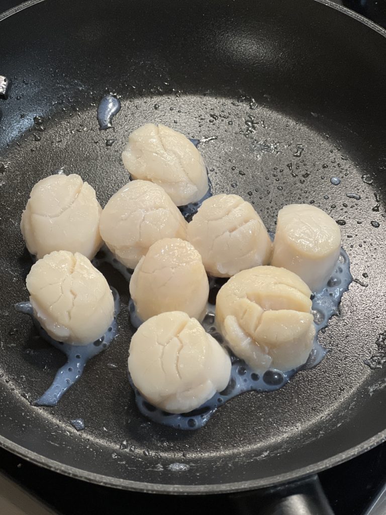 - Saisissez les noix de Saint-Jacques environ 1 minute de chaque côté, juste pour obtenir une légère coloration. Attention à ne pas trop les cuire pour qu’elles restent tendres et fondantes.