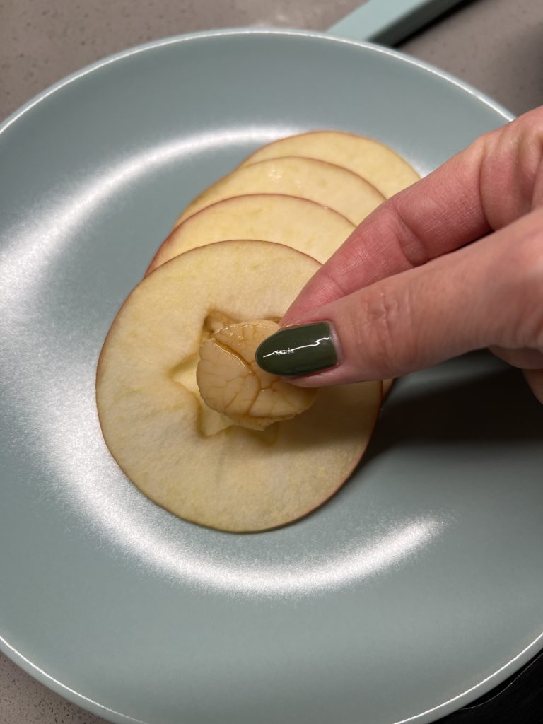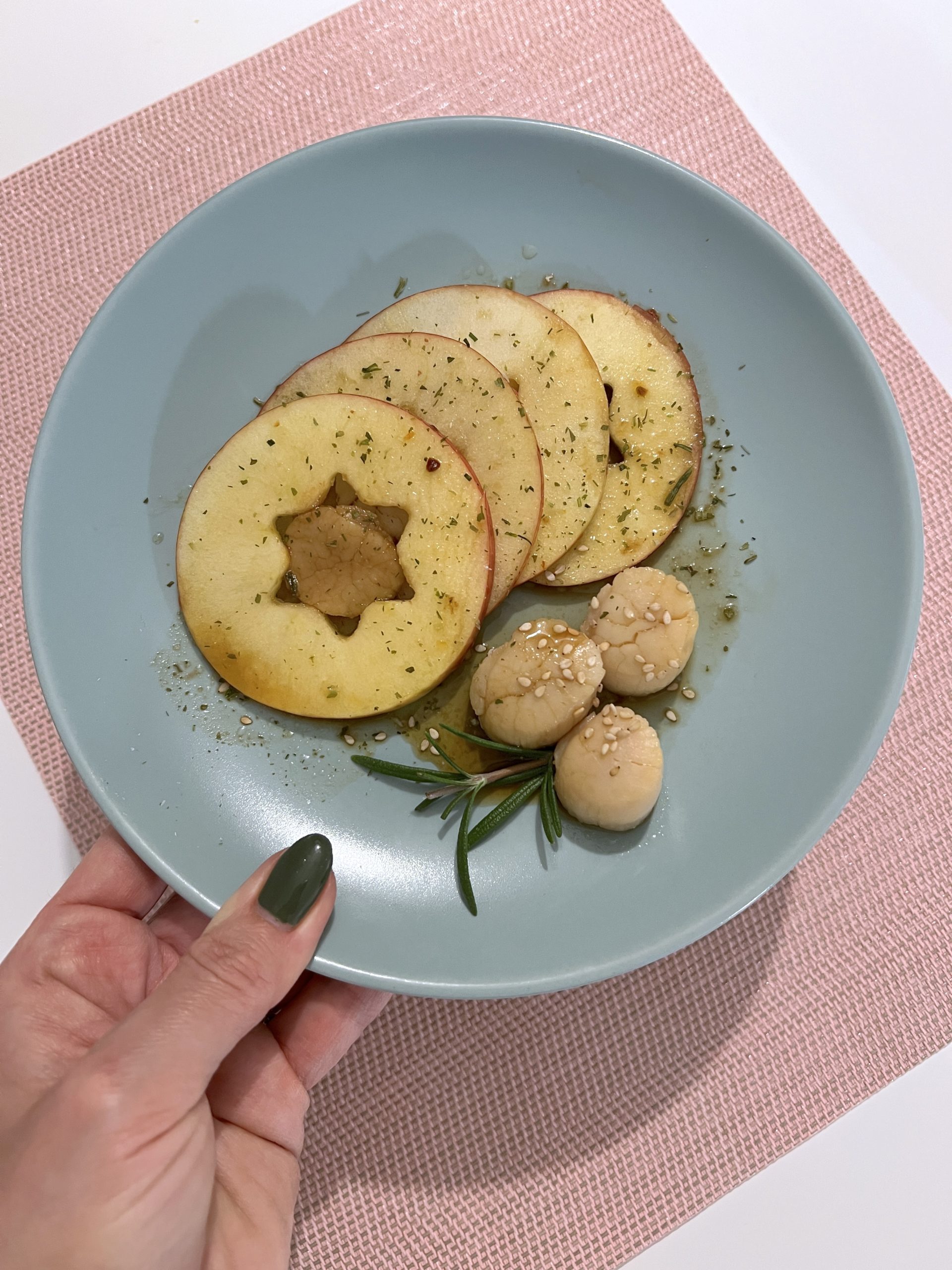 - Disposez une tranche de Pink Lady et si vous le souhaitez couper le centre à l’emporte-pièce pour lui donner une forme originale où la Saint-Jacques sera placée.