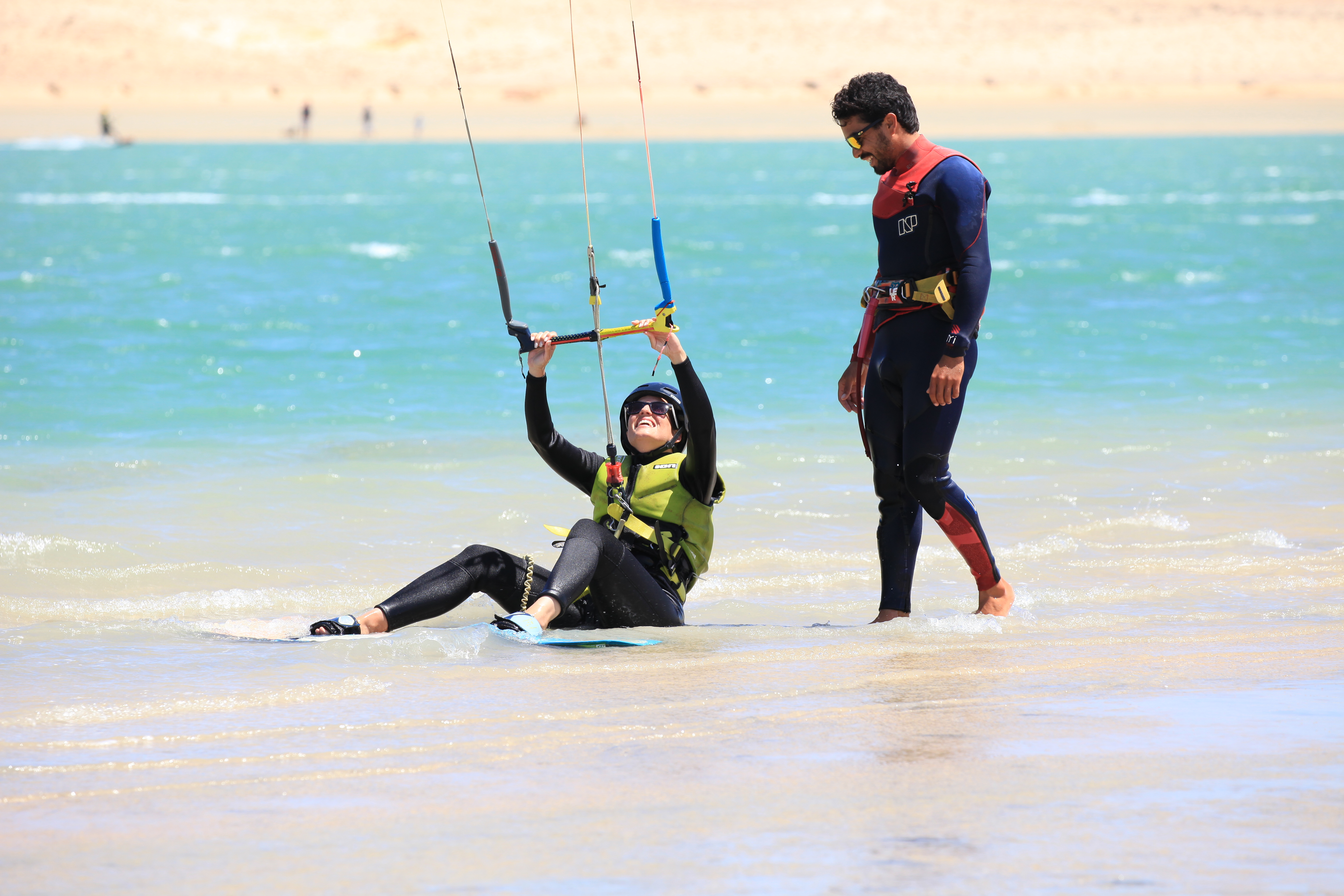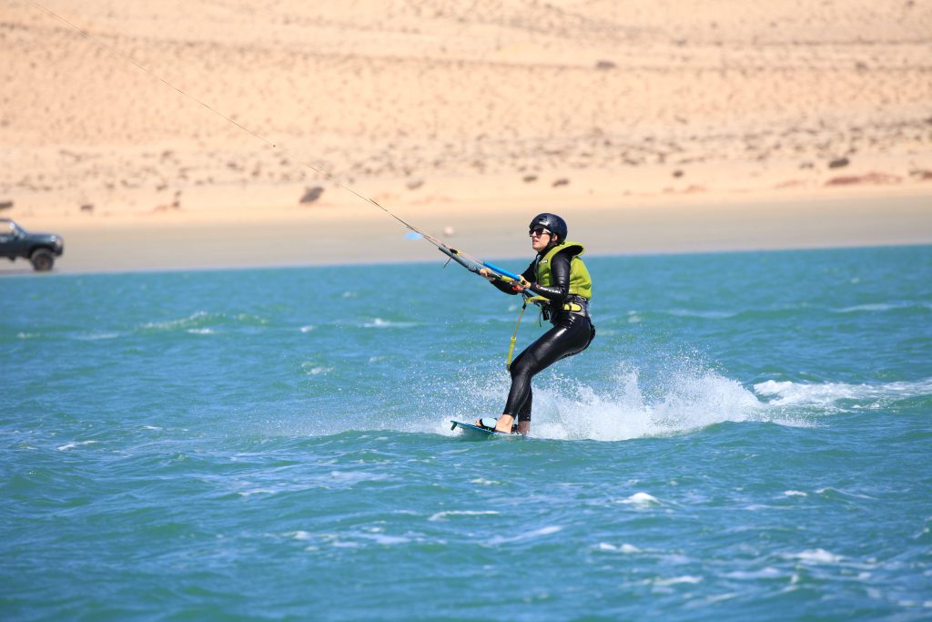 Au départ, c’était mal engagé pour moi. Après avoir appris à correctement accrocher les lignes à ma voile, très crispée, j’ai eu du mal à lâcher prise et prendre confiance. Au bout de la 4ème heure, je vous avoue même que j’ai hésité à abandonner, pensant que ce sport n’était pas fait pour moi car je n’étais pas rassurée par les gestes que j’exerçais jusque-là. Ce n’est qu’une fois dans l’eau que j’ai finalement réussi à me détendre et à prendre du plaisir. Ont suivi, quelques heures de nage tractées, à faire bouger la voile pour apprendre à la maîtriser, dans un sens et dans l’autre. Et puis, est ensuite venu le temps de mettre les pieds sur la planche ! Il a donc fallu démontrer que le fameux dicton disait vrai… j’étais capable de gérer plusieurs choses en même temps.