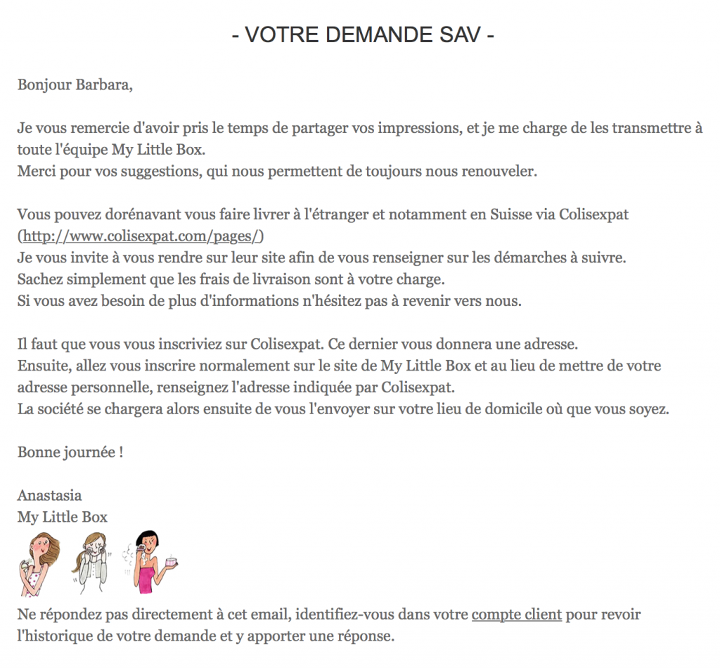 Malheureusement, elle n’est pas encore livrable en Suisse… J’avais contacté le service après-vente pour leur suggérer l’idée en juillet 2016, vous trouverez leur réponse ci-dessous. L’envoi direct en Suisse ne semble pas être une de leur option pour le moment, ils proposent cependant d’utiliser un système de transfert de colis via Coliexpat.