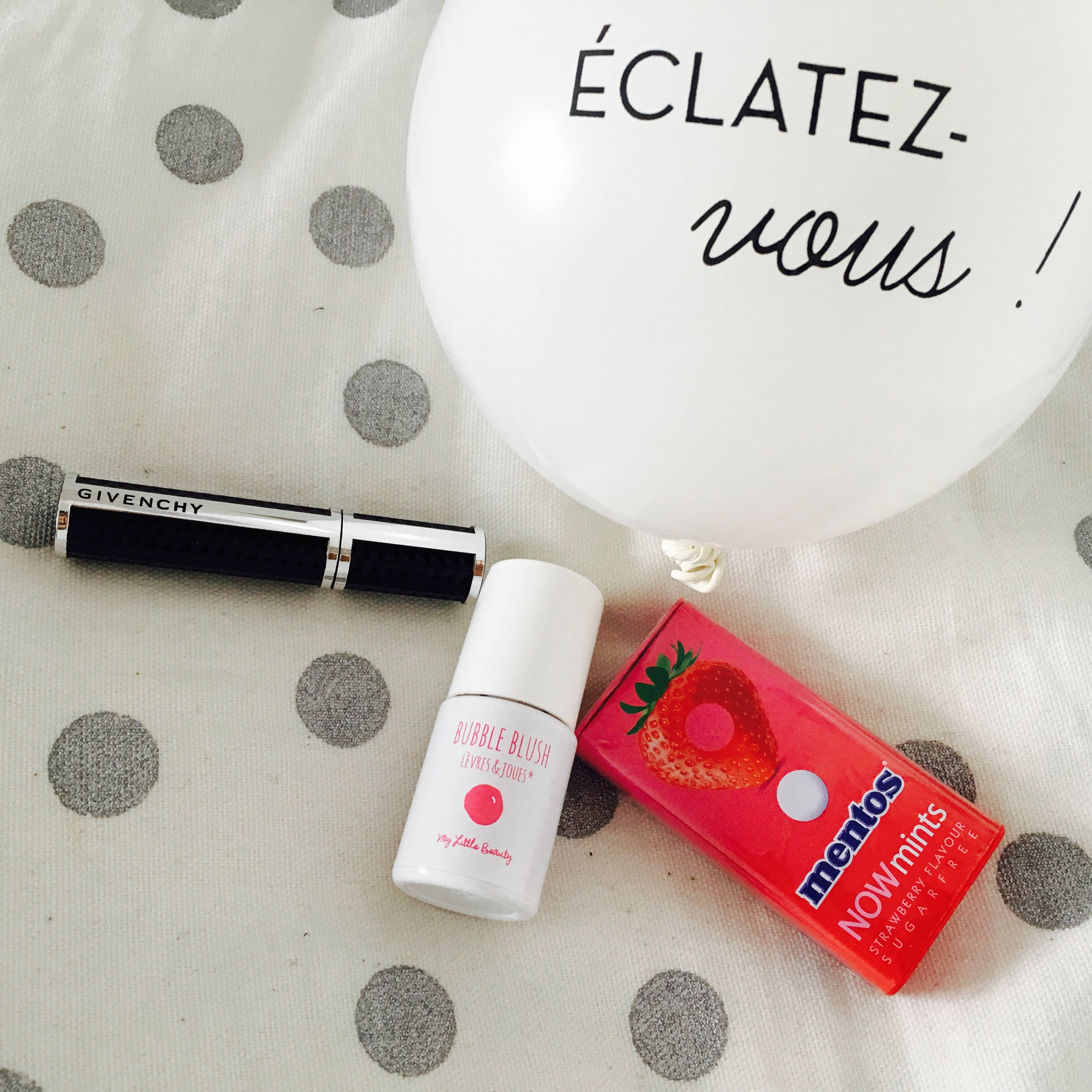 Un ballon fun, un mascara qui ressemble à un joli bijou, un blush à lèvres & joues et des bonbons à la fraise