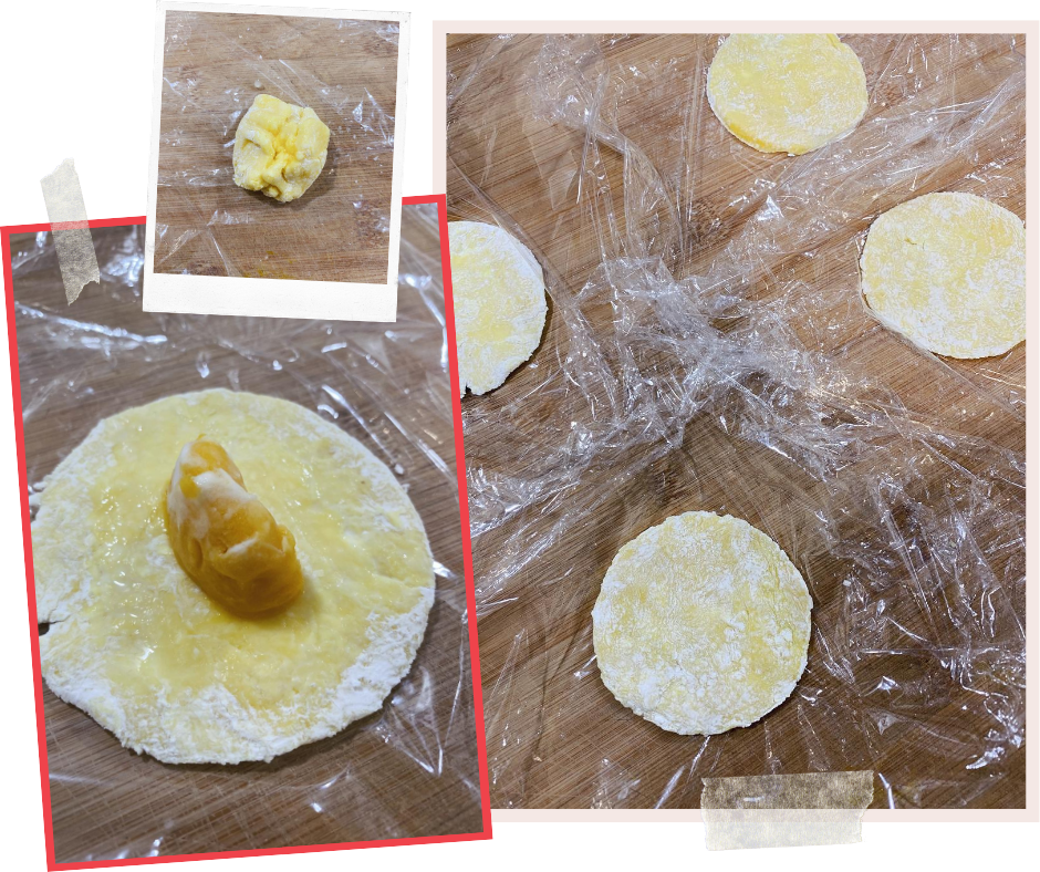 - Avec un emporte-pièce de 10 cm de circonférence (ou une tasse), découpez autant de ronds que vous pouvez et déposez-les chacun sur un morceau de film plastique (pas de papier d’aluminium, ça ne réagit pas bien au froid)