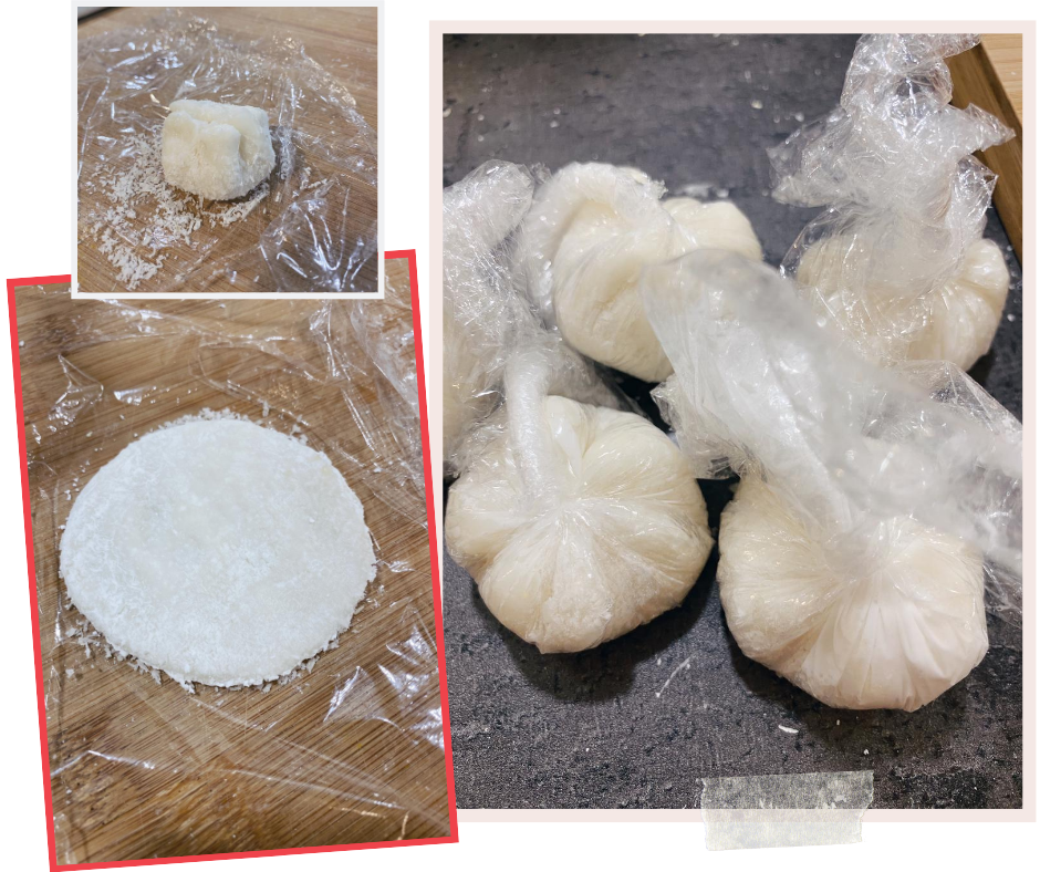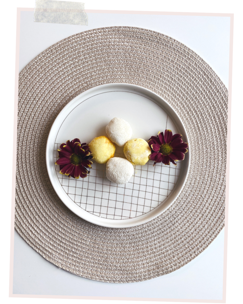 - Si vous optez pour des mochis à la coco, saupoudrez de noix de coco vos ronds de pâtes une fois que vous les mettez sur le film plastique