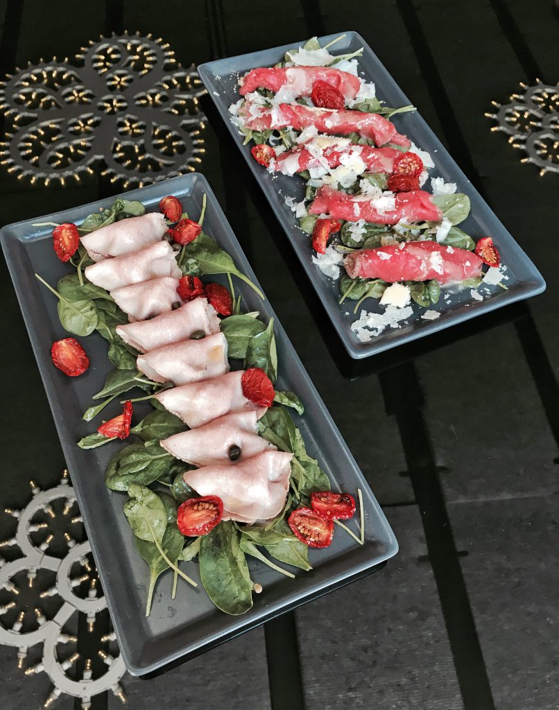 - Carpaccio Luigia: Carpaccio de boeuf, artichauts, salade d’épinards, gaufre de Grana Padano