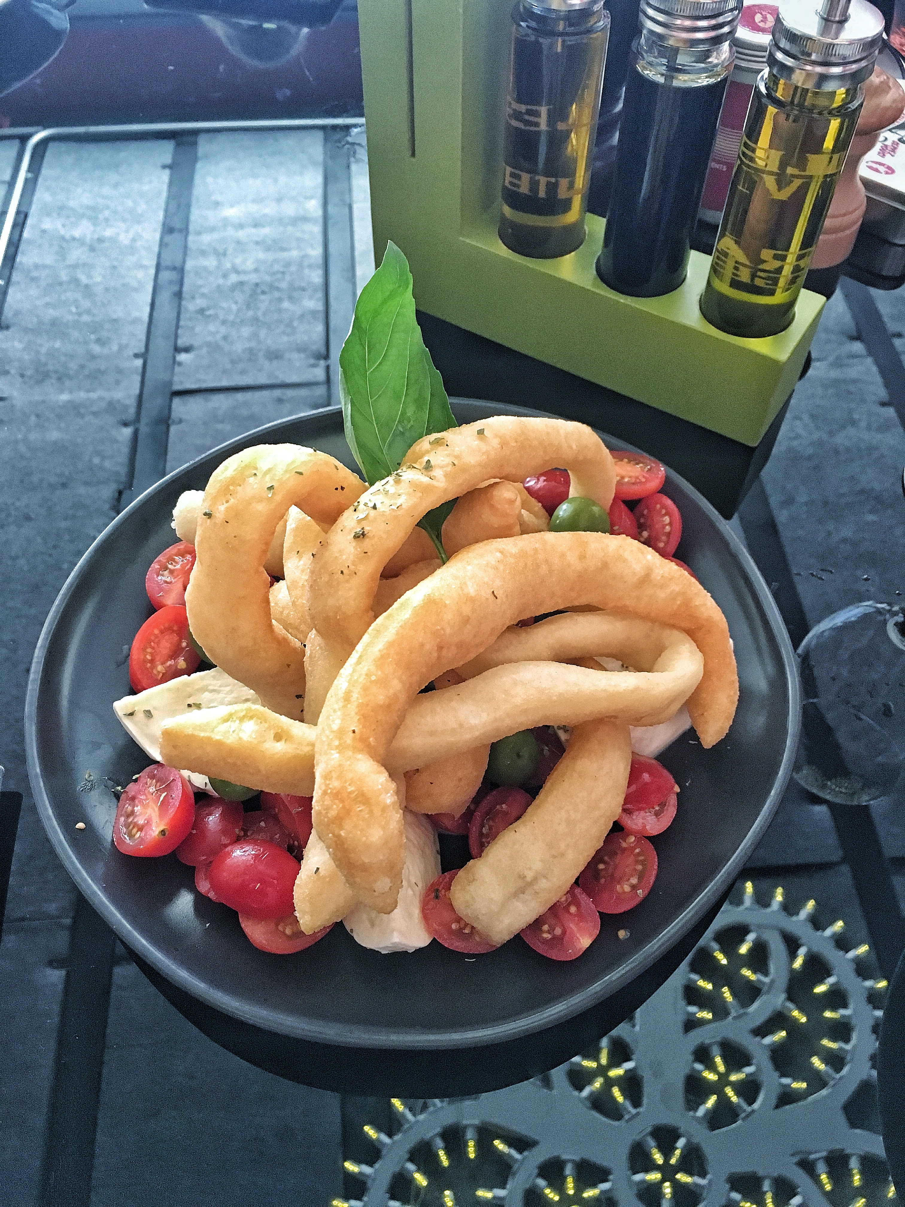 - Chiacchiere Napoletane: Beignets de pâte à pizza frits avec bufala, olives vertes, tomates datterini, basilic, origan