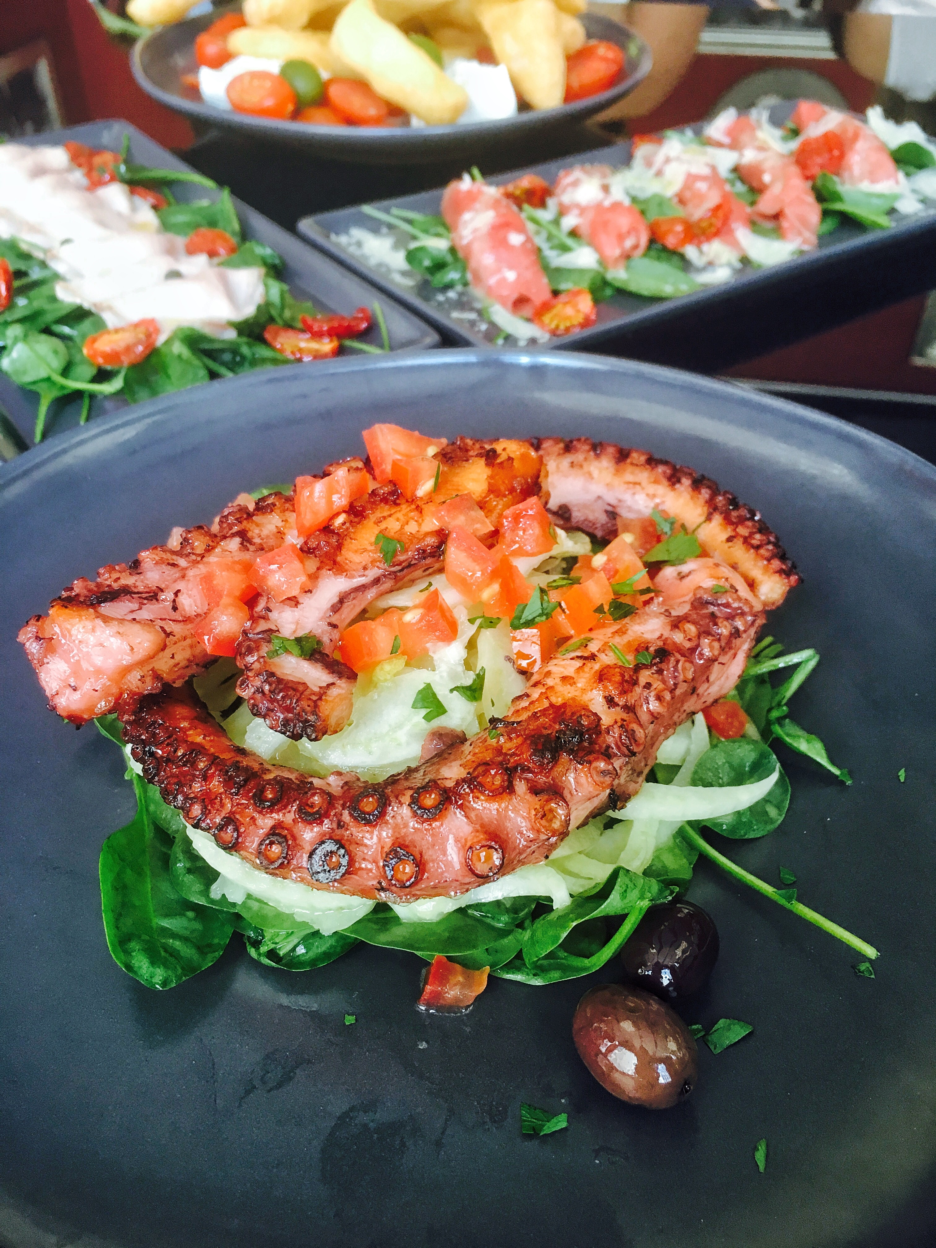 - Polpo grigliato: Poulpe grillé avec salade d’épinards, fenouil, olives noires, tomates concassées et citron