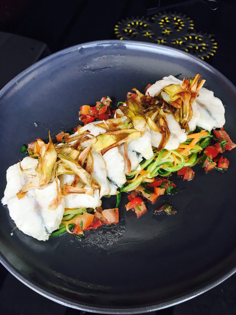 - Scottatina di branzino: Filet de loup de mer saisi vivement avec artichauts et légumes de saison à la poêle