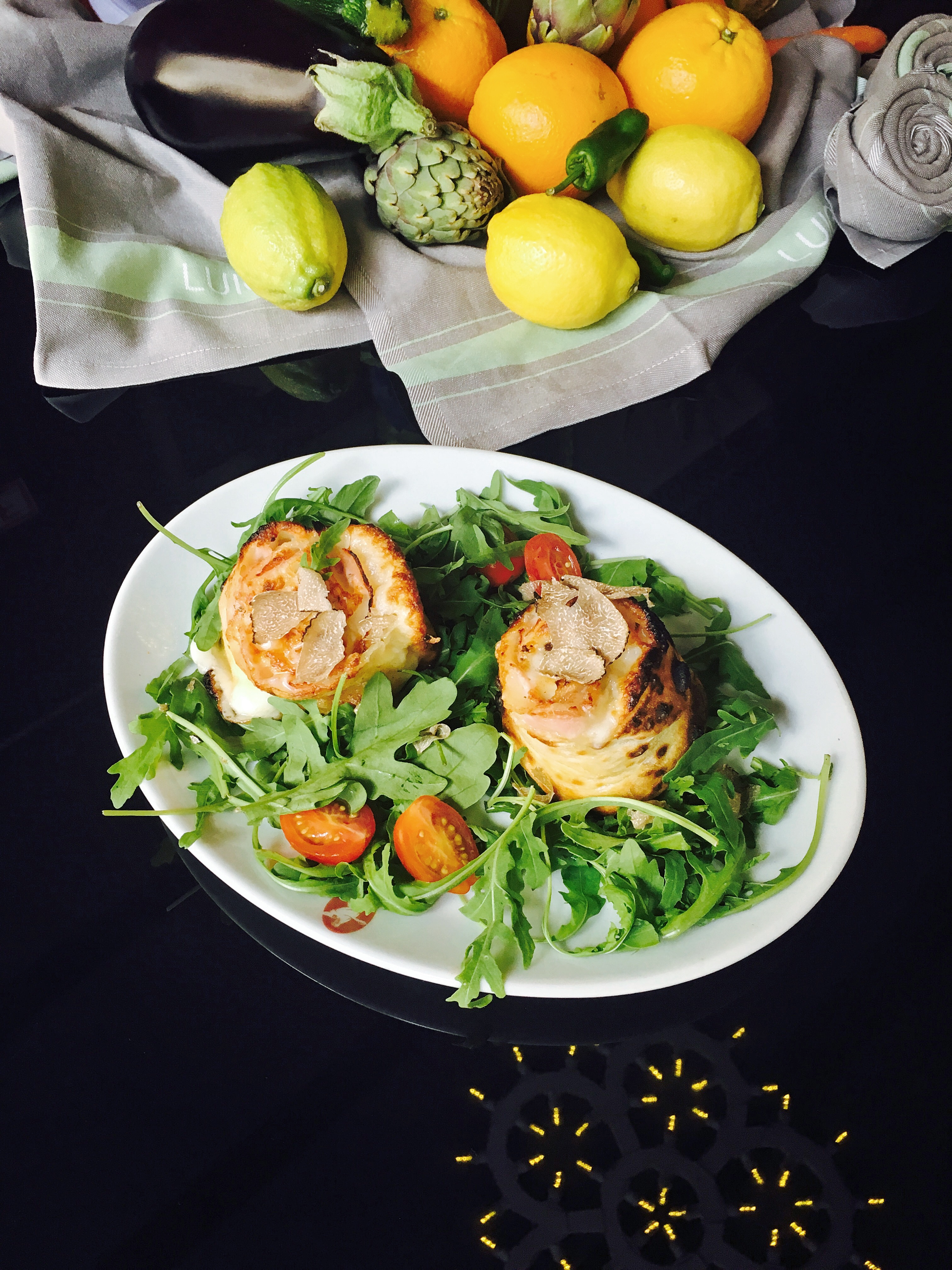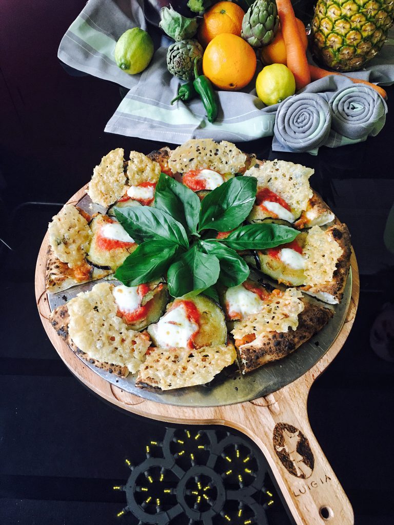 - Mulignana: Crème d’aubergine, sauce tomate, aubergines frittes, mozzarella de bufala, gaufre de Grana Padano, basilic