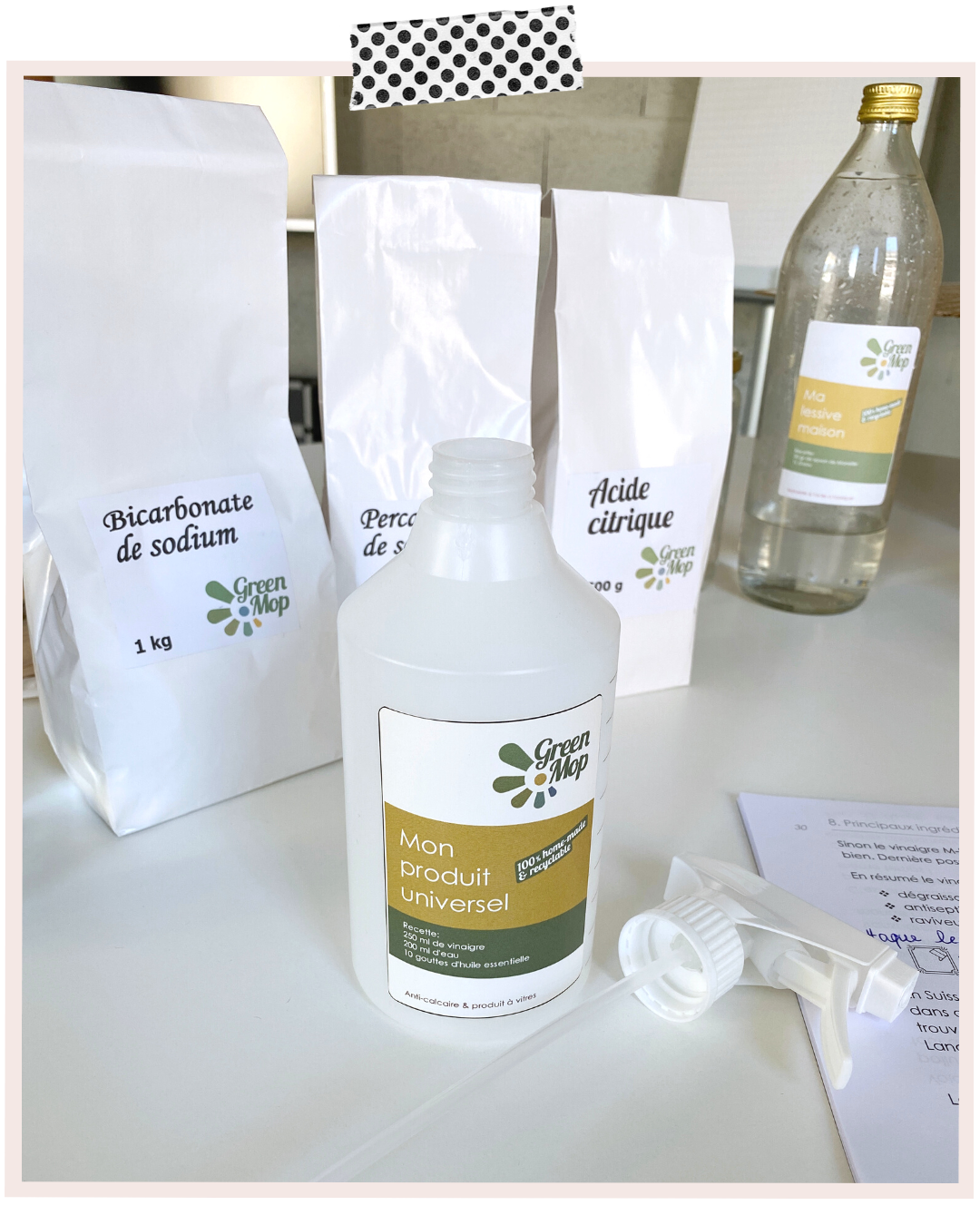 Nous sommes ensuite passées à la réalisation de 4 produits pour la maison à l’aide des ingrédients présents dans la GreenMop Box qui trônait sur notre table depuis notre arrivée en classe: