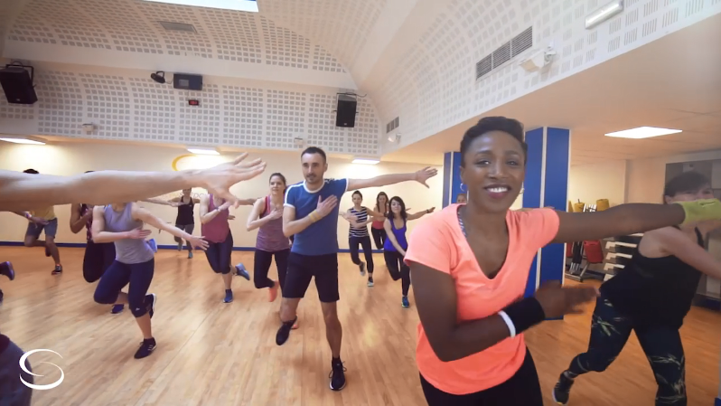 Les participants se positionnent en cercle autour du coach dans une salle de sport et suivent les mouvements en rythme sur de la musique entrainante. Durant une heure, les exercices de warm-up, cardio, stretching se suivent pour un entraînement complet.