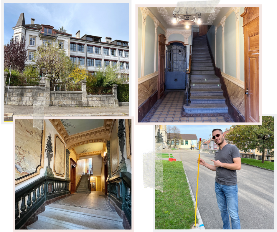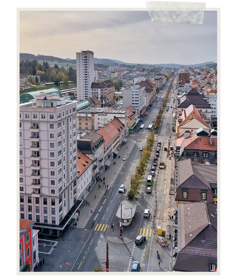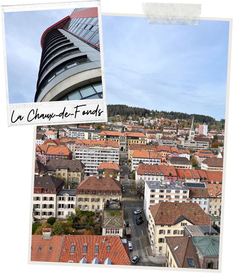 Nous sommes montés sur la tour Espacité qui trône au centre, pour voir la ville d’en haut, puis nous nous sommes baladés dans différents quartiers pour observer l’architecture très atypique de la Chaux-de-Fonds.