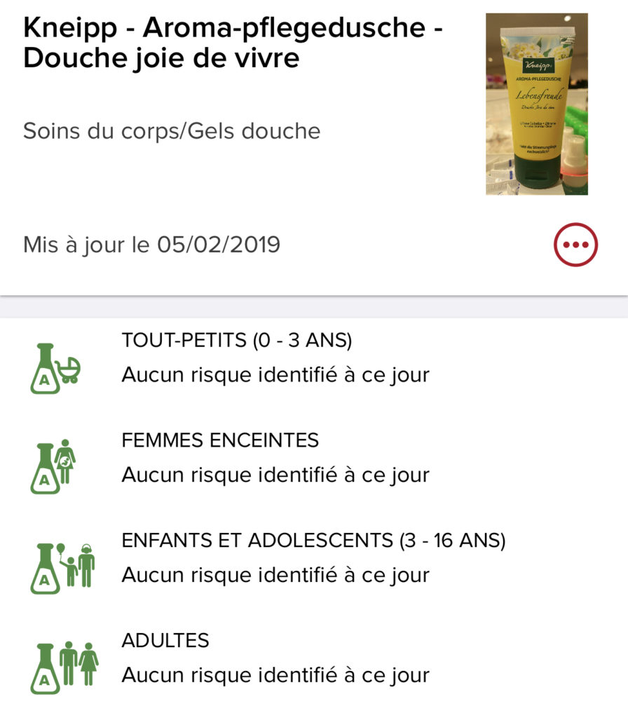 Concernant les compositions des produits Kneipp, vous pouvez y aller les yeux fermés, ils sont naturels! Voici le résultat du scan du gel douche Joie de vivre: